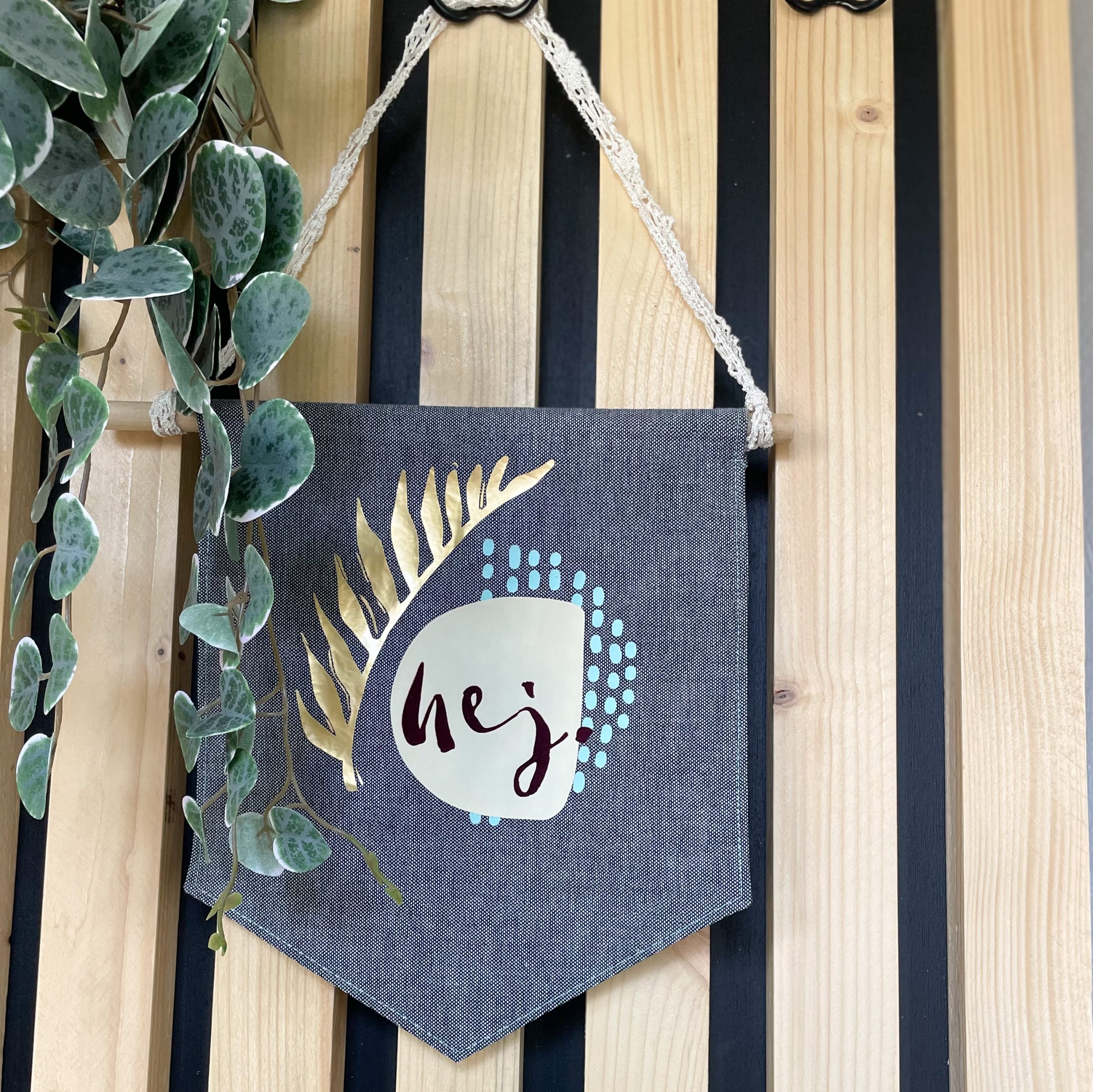 Bei diesem Muster haben wir zuletzt das goldene Blatt aus SpeedFlex Folie aufgepresst, da dieses nur eine Presszeit von 3 Sekunden benötigt. Für noch mehr Effekt sorgt dabei die PremiumFlockfolie die wir für das „hej“ verwendet haben. Die Flockfolie eignet sich durch ihre beflockte Oberfläche ebenfalls toll für die oberste Schicht.
