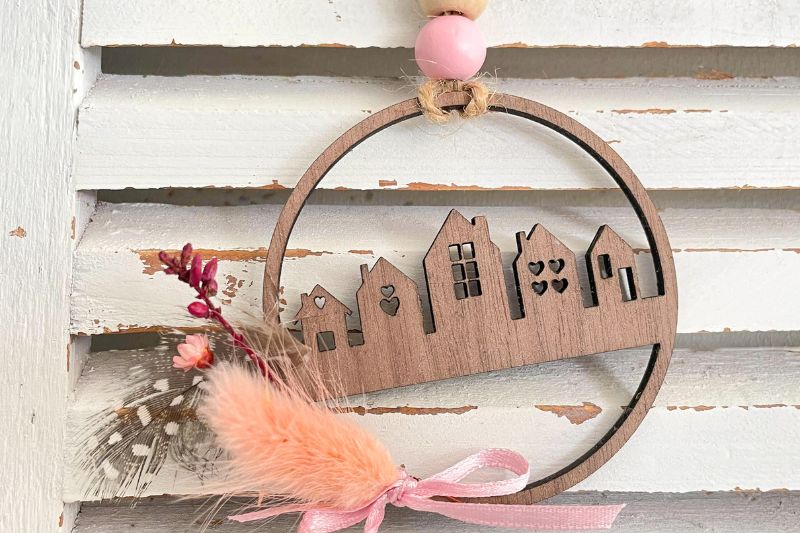 Mit deinem Laser kannst du den Häuschenkranz schnell aus dünnem Holz schneiden. Das verleiht dem Türkranz eine natürliche und rustikale Note. Du kannst das Holz anschließend bemalen oder lasieren, um es wetterfest zu machen und ihm einen persönlichen Touch zu verleihen.
