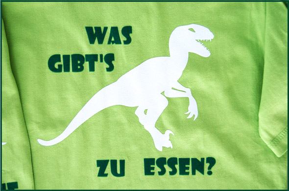 Die Dinosaurier und Katzenmotive für die Kinder-Shirts habe ich mir aus dem Silhouette Online Shop geladen. Nach dem Plotten der Tiermotive und Schriftzüge aus den verschiedenen Farben Flockfolie musste ich die Einzelteile nur wie gewünscht auf den Kinder-Shirts positionieren und mit dem Bügeleisen bei ca. 150 Grad für ungefähr 30 sec. aufbügeln. Kurze Zeit abkühlen lassen, Trägerfolie abziehen und fertig!