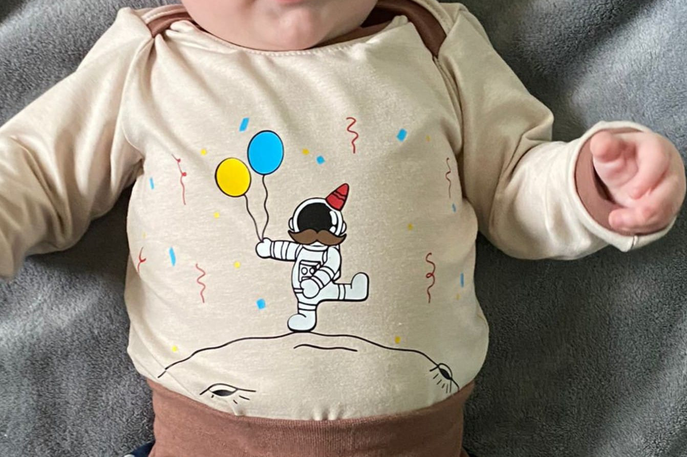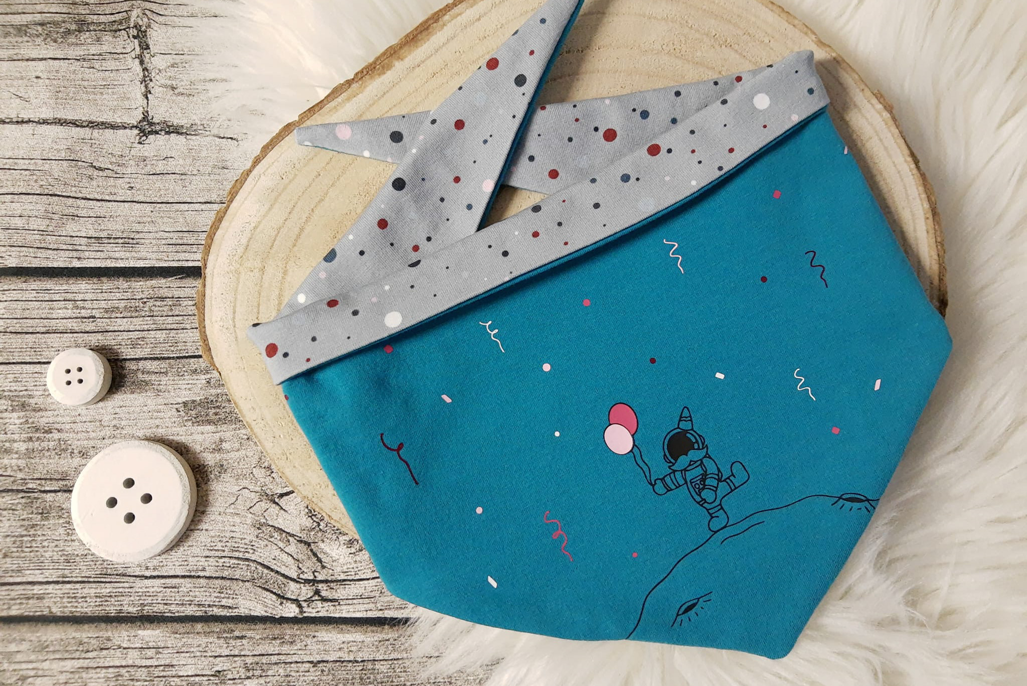 So kommt man warm durch den Frühling – mit dem Astronaut auf dem Halstuch – genäht von Petras Pinke Nähecke.