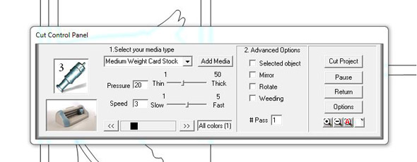 Wie das so ist, wenn man so ein neues Spielzeug hat, muss ich euch glaube ich nicht erzählen, man wird schnell wieder in die Realität zurück geholt. Diese Erfahrung musste auch ich machen, obwohl ich nur mal schnell Papier schneiden wollte. Es fing schon mit den Voreinstellungen im Inspiration Studio an: Bazzill Cardstock – welche Material-Auswahl ist die richtige? Habe mich dann für Medium Weight Cardstock entschieden, Druck 18, Messertiefe 2,5, Geschwindigkeit 3. Tja, wie sollte es anders sein, klappte nicht. Also testen: Druck 20, Messer 2,5, Geschwindigkeit 2. Wow, das Ergebniss war gut, zum Testen reichte ja erstmal ein Herz der Größe: 2 x 2,5 Inch.