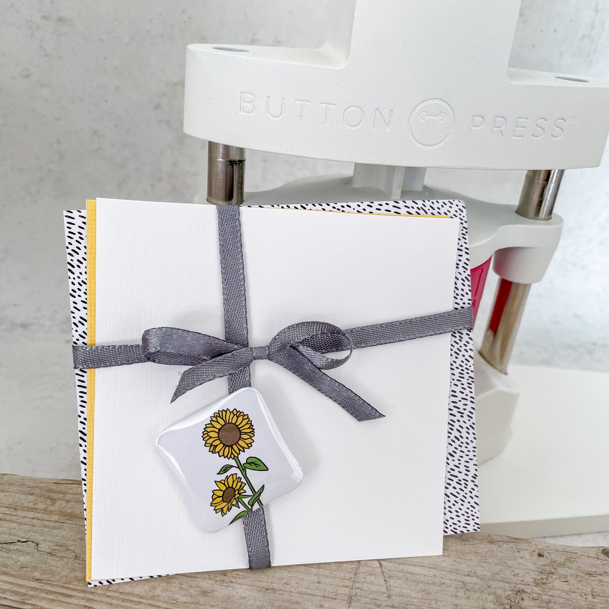 Ob für die nächste Karte, als Giveaway, oder zum selber tragen. Mit der We R Memory Keepers button Presse könnt ihr im Handumdrehen coole Buttons für jeden Anlass erstellen. Hier haben wir die coole quadratische Button Form verwendet.
