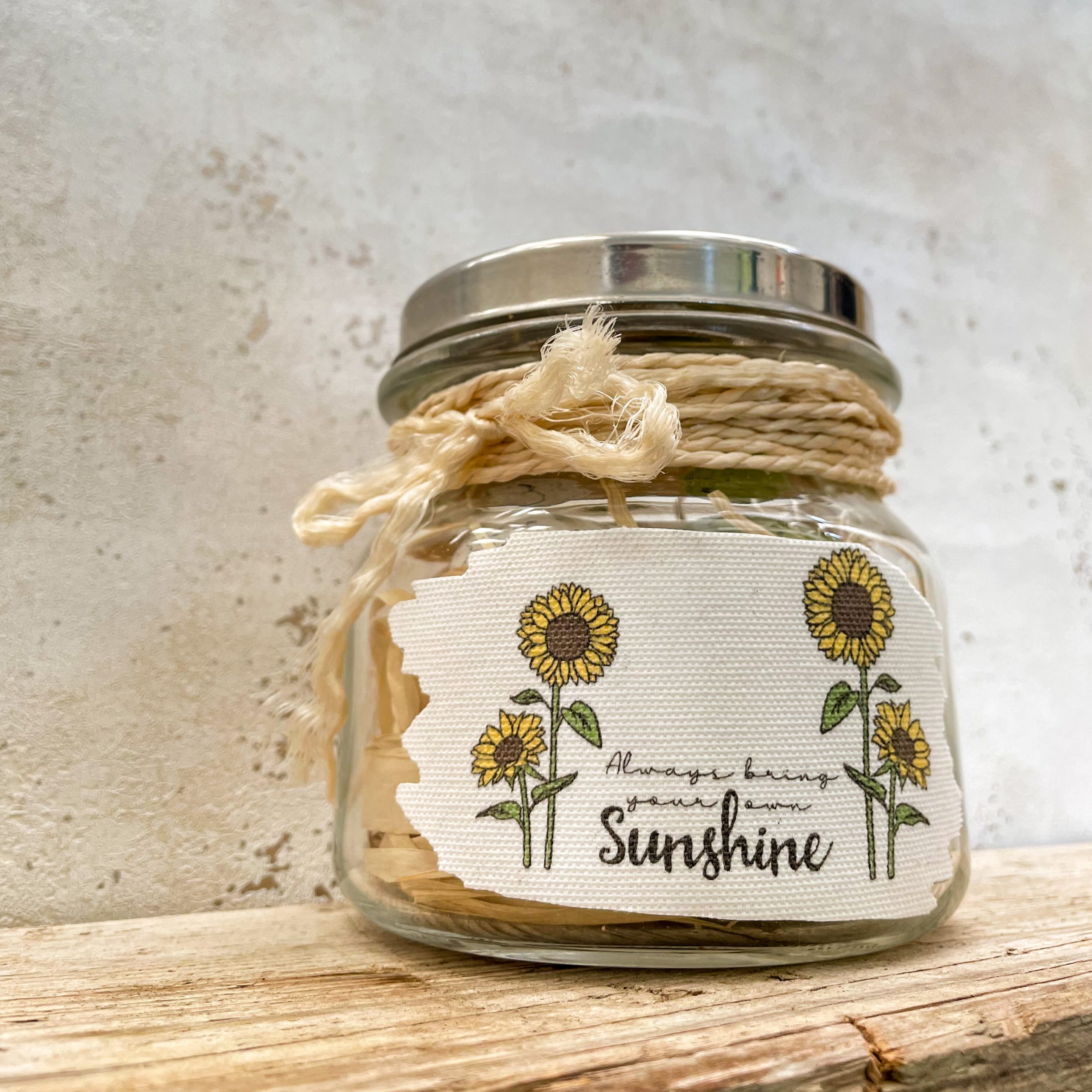 Für unser Beispiel haben wir bedruckbaren Stoff als Sticker verwendet. So kann man schnell aus einem alten Glas ein tolles Osternest „to go“ basteln.