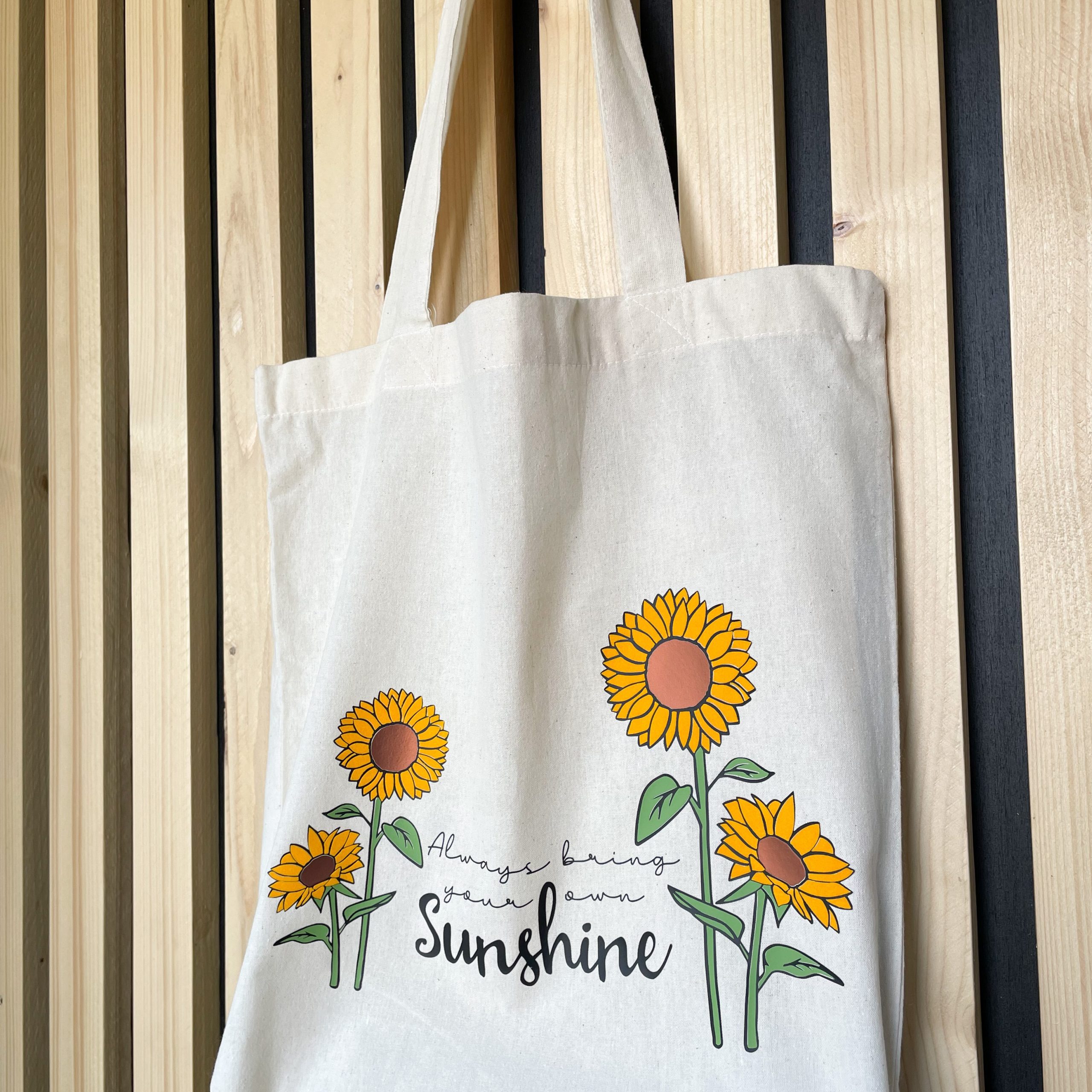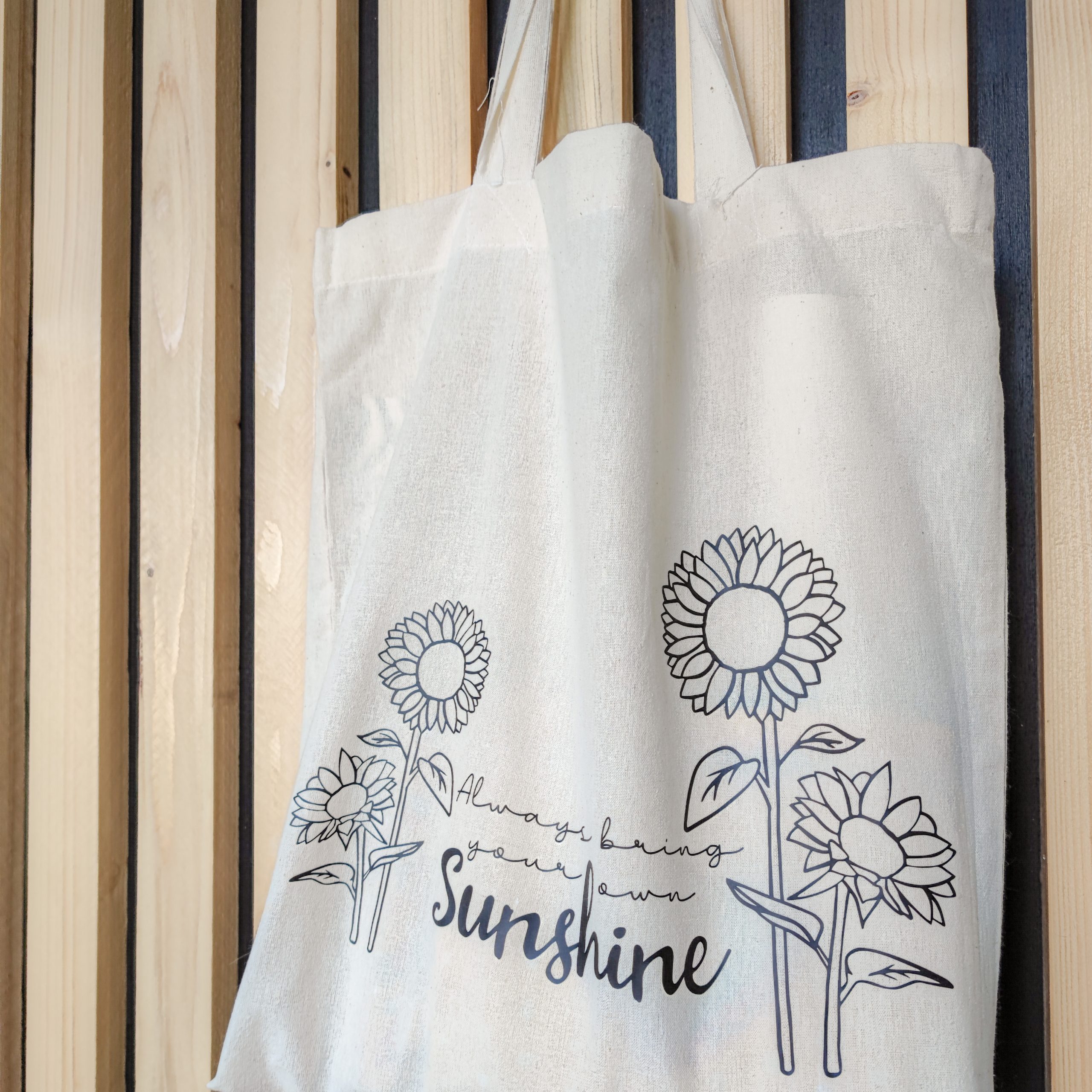 „Always bring your own sunshine“ solche Stoff-Markttaschen sind schnell beplottet und zudem einfach immer zu gebrauchen. Für dieses Beispiel haben wir Flex- und Flockfolien gemixt. So entsteht eine wunderbare Optik.
