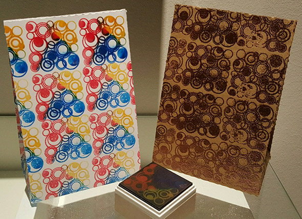 Für diesen Beitrag habe ich einen Stempel mit Kreisen in 45×45 mm erstellt und in gelb, blau und rot eingefärbt.