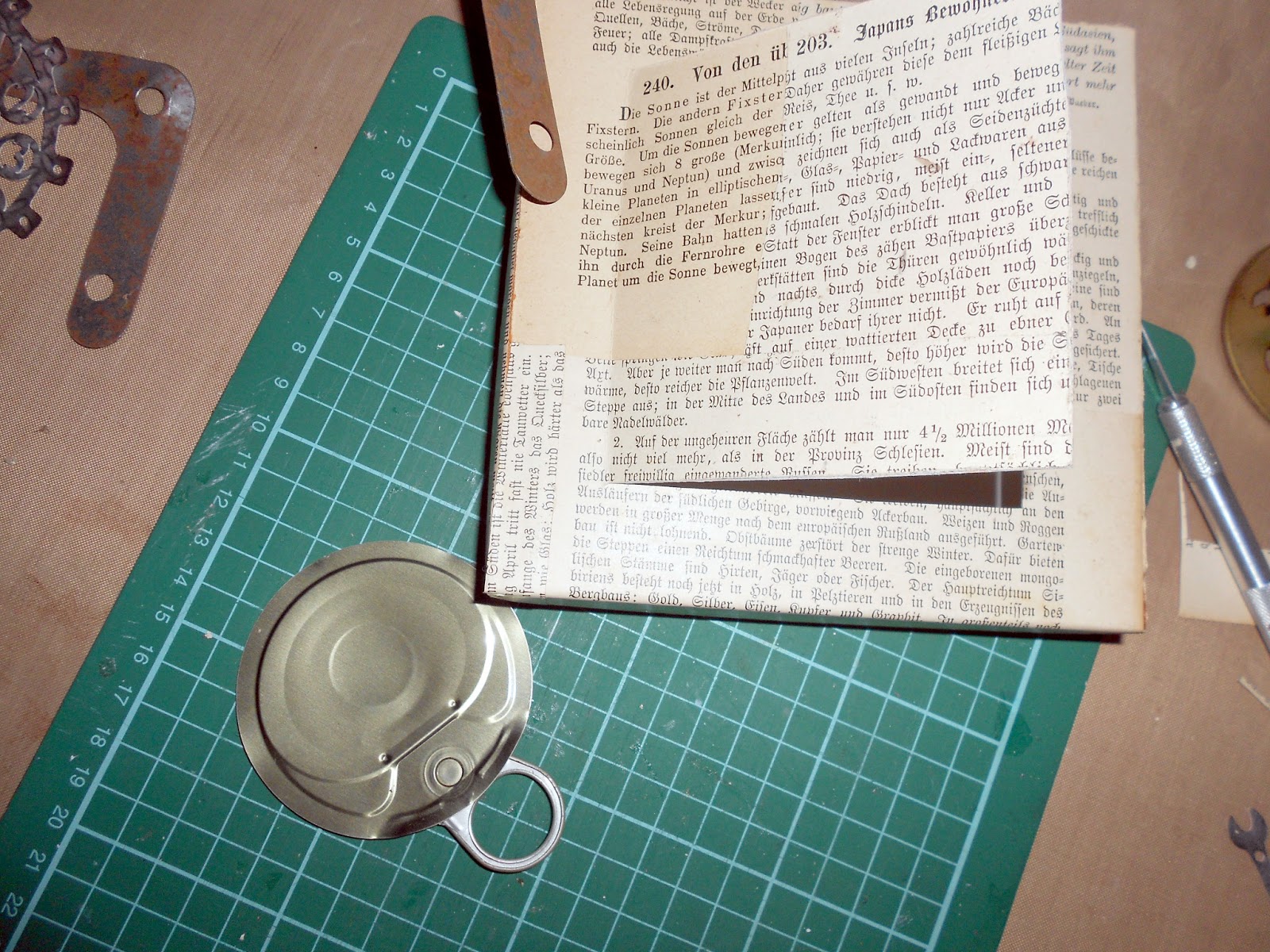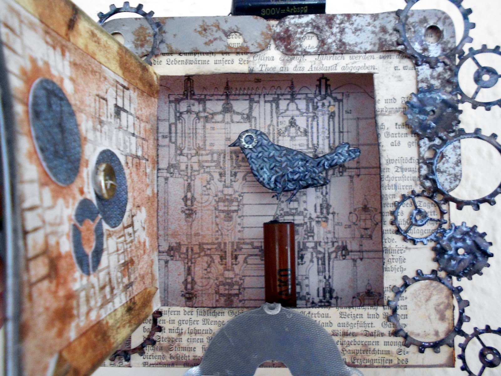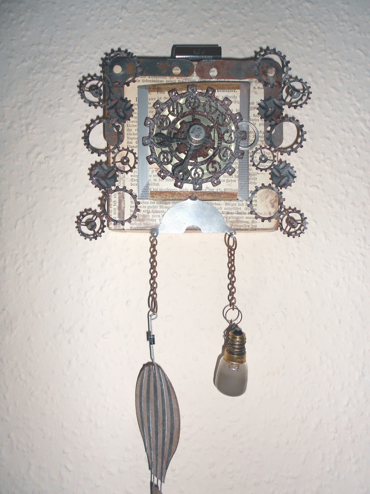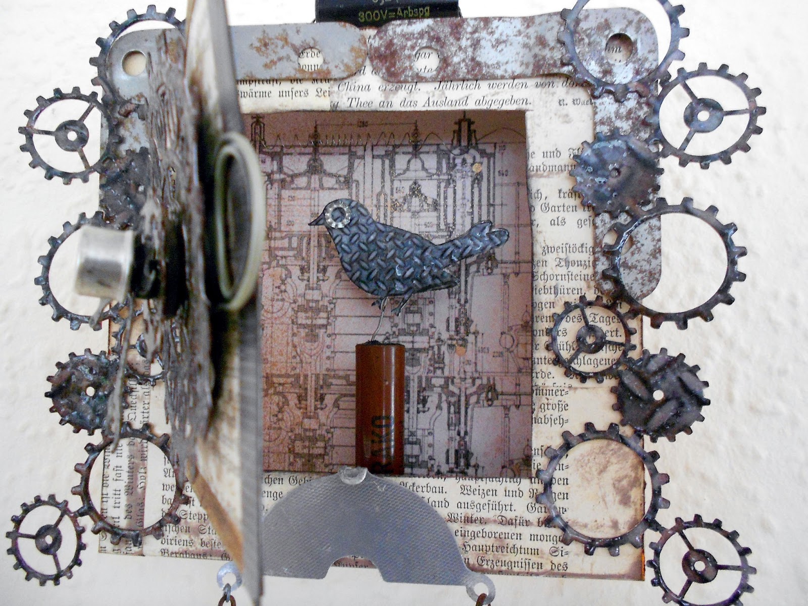 Umklebt mit alten Buchseiten bildet sie den Korpus für meine „Kuckucksuhr“. Verrostete Winkel umrahmen den oberen Teil, ein Katzenfutterdeckel ermöglicht das Öffnen des Türchens.