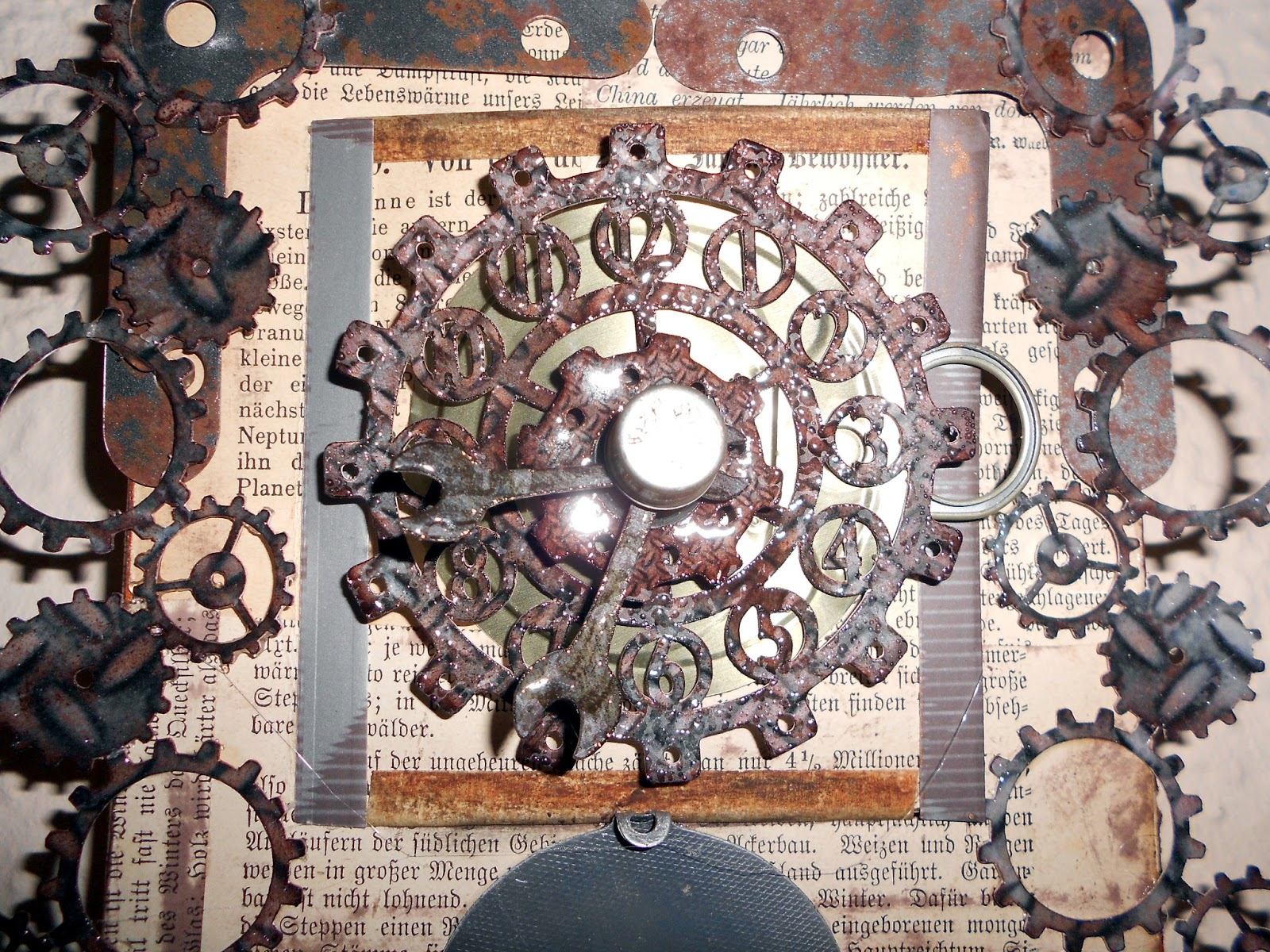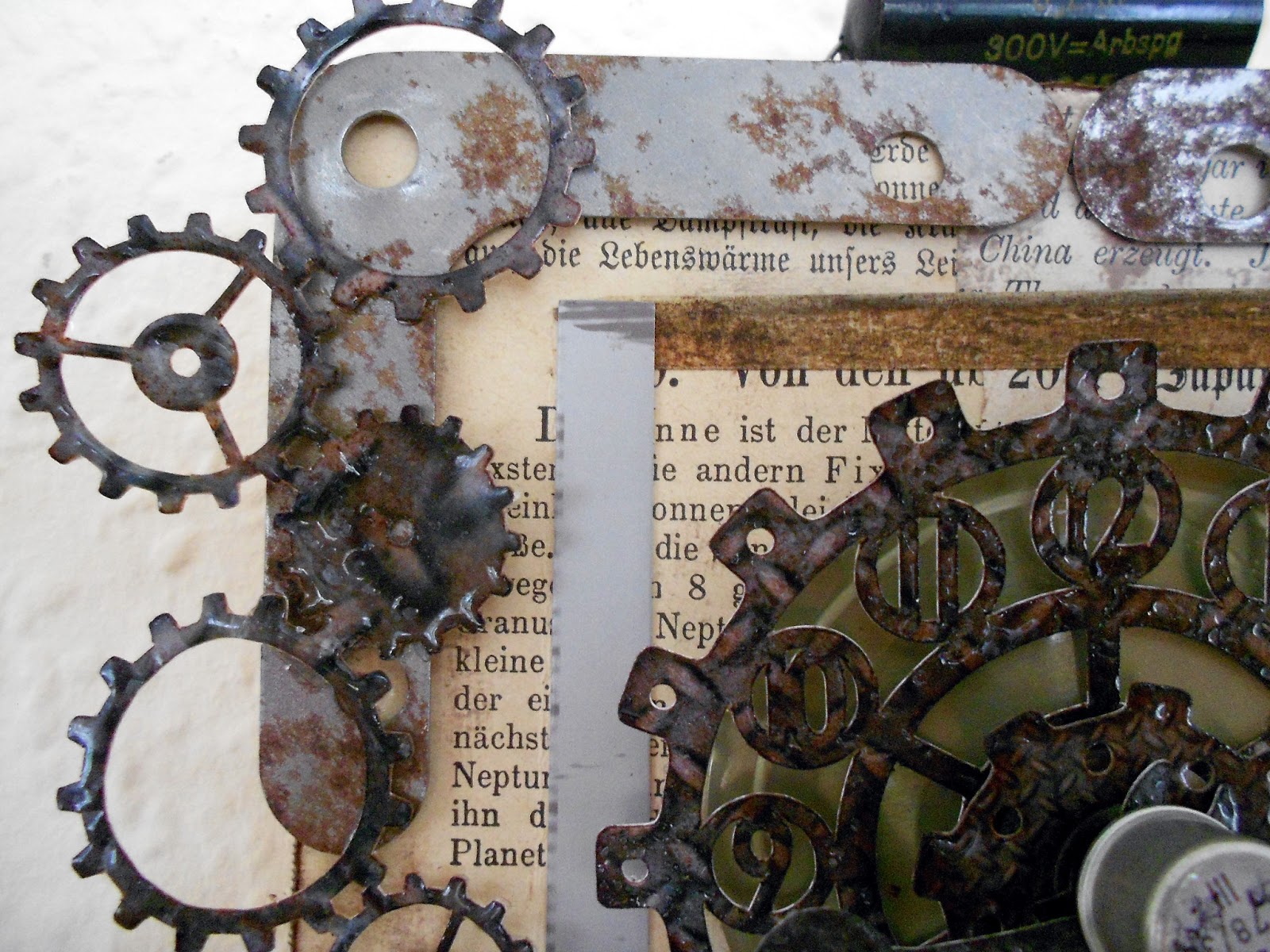 Steampunk fasziniert mich seitdem ich davon hörte. Meine romantische Blümchenseele hat mich jedoch bislang von ernstzunehmenden Experimenten abgehalten. Bis die Bastelbeiträge meiner Blogfreundinnen mich motiviert haben, Schrauben und Muttern mit Kleber und Farbe zu verbinden.
