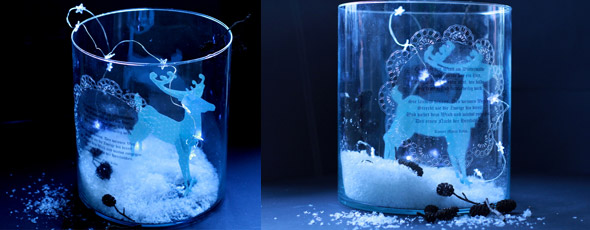 Als Basis wurde hier eine günstige Vase mit dem „PRINTABLE CLAER STICKER PAPER“ Medium verziert und mit dem Gedicht „Advent“ von R.M. Rilke bedruckt. Im Inneren steht ein Rentier im Schneegestöber. Die Datei (3D standing Reindeer) ist im Silhouette Online-Store erhältlich.