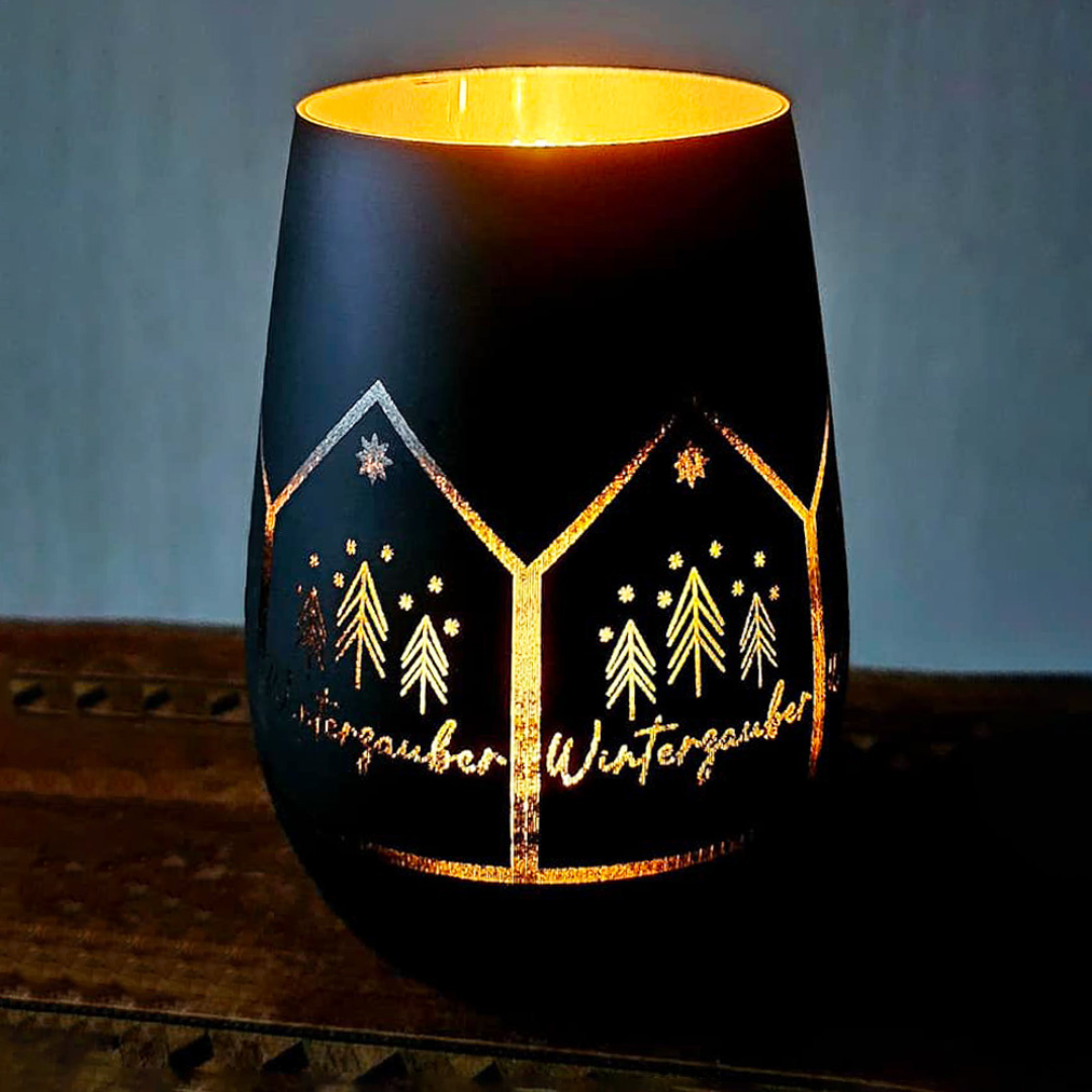 Was wäre die Winterzeit ohne das warme Flackern und den Duft von Kerzen? Noch stimmungsvoller wird es mit diesem besonderen Windlicht. Graviert mit dem Winterzauber Design schaffst du so in deinem Zuhause eine gemütliche und wohlig warme Atmosphäre.