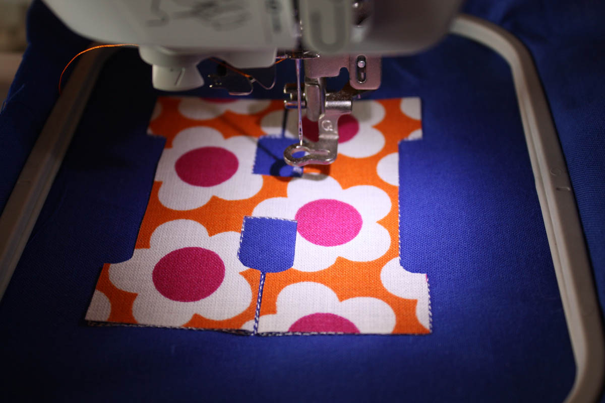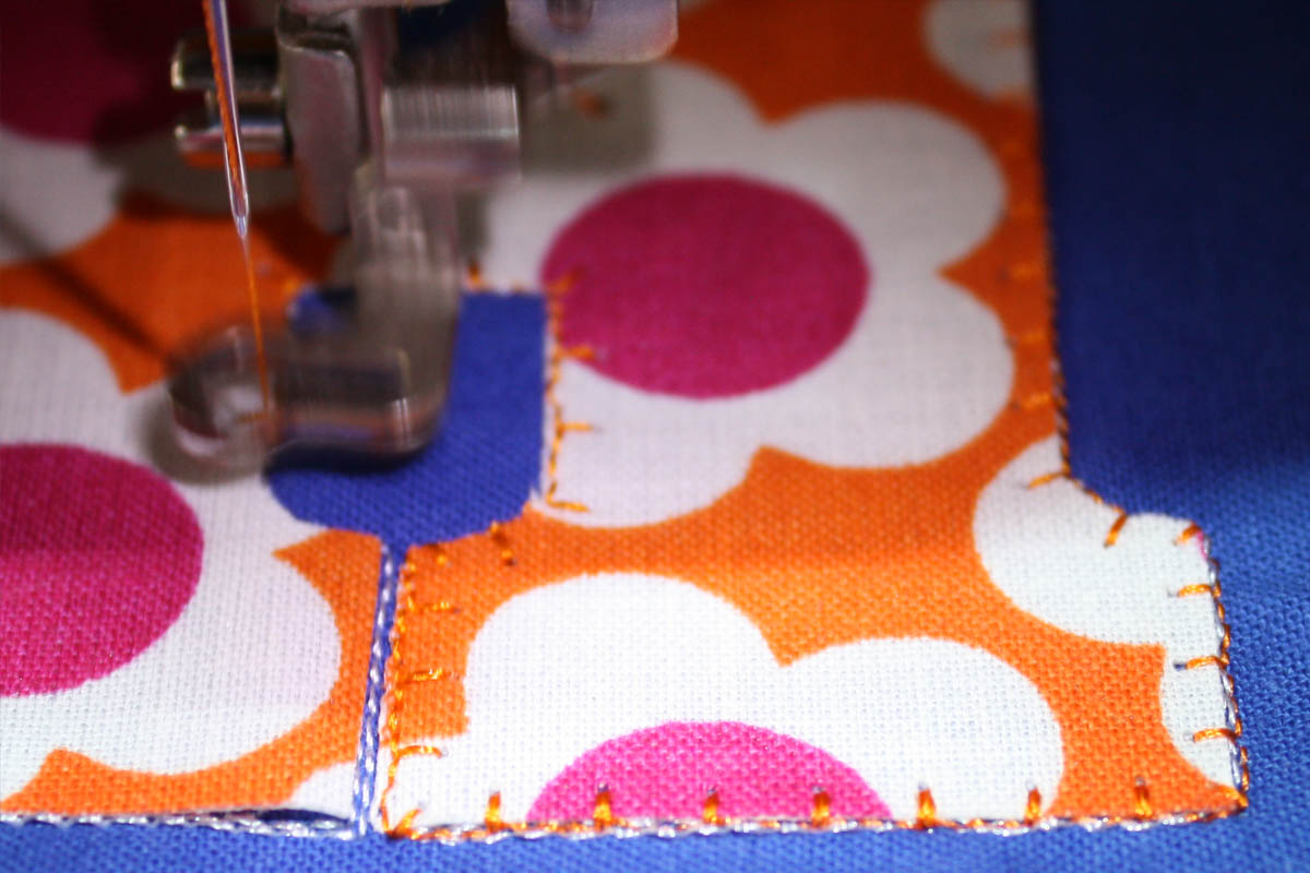 Im nächsten Schritt wird das Stoffteil nun mit einer einfachen E-förmigen Naht festgestickt. Man erkennt im Bild, dass diese einfache Naht in E-Form auch einen schönen Effekt bewirken würde.