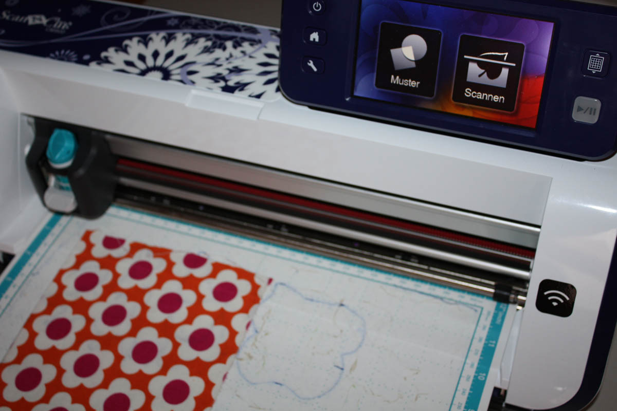 Nachdem der gewünschte Buchstabe gewählt wurde, muss dieser natürlich auch passend auf den Stoff platziert werden. Dazu wird zunächst ein Vorscann durchgeführt, der die Lage des Textils auf der Schneidematte im Display anzeigt. Auf diese angezeigte Situation der Schneidematte kann nun einfach mit den Stift die zu schneidende Kontur geschoben werden und dann wird der Schnitt gestartet.