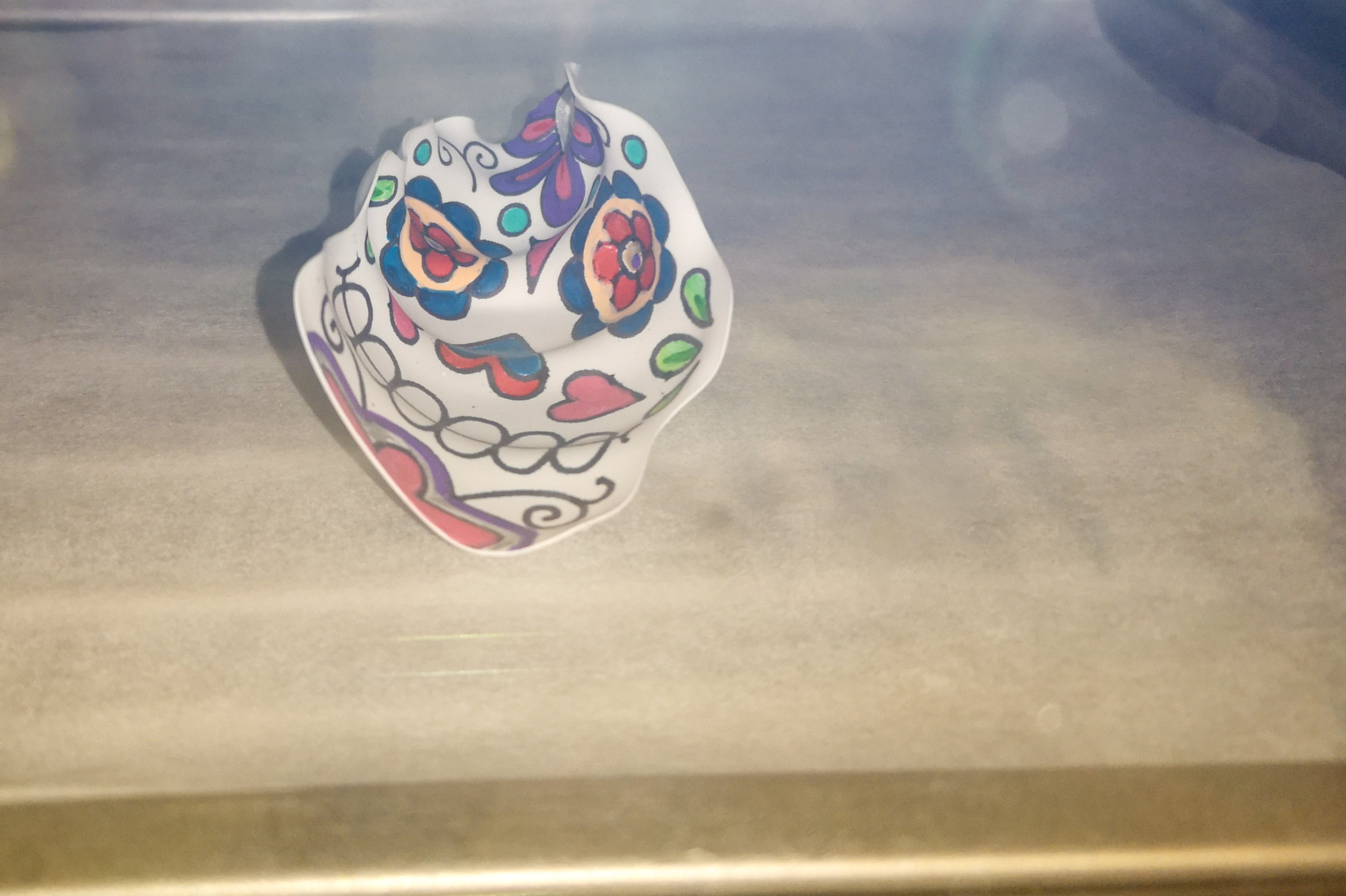 Sobald alles fertig ausgemalt ist kann ich den Anhänger im Backofen auf die richtige Größe schrumpfen lassen. Gebacken wird der Anhänger dann bei ca. 160° C.