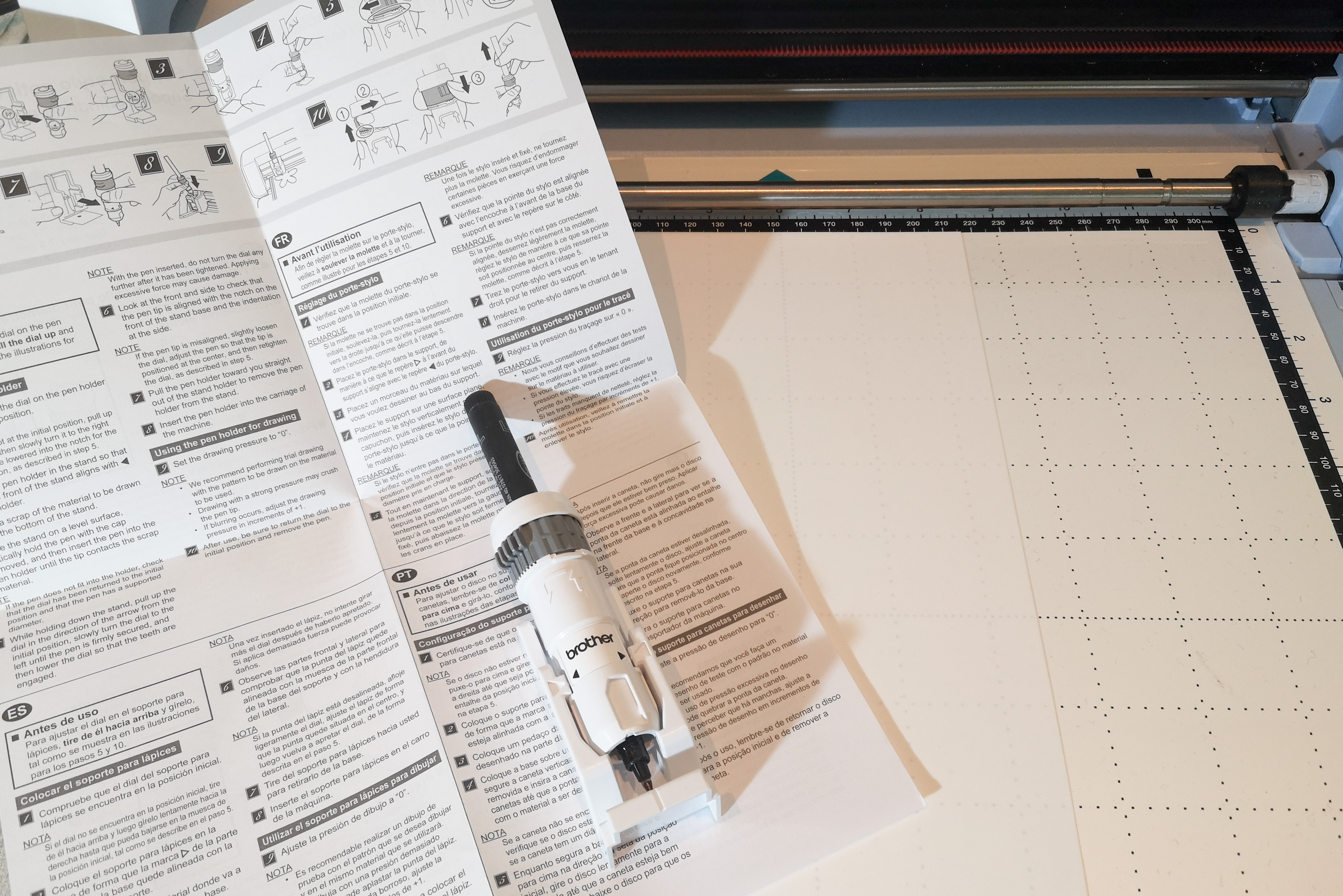 Um ein optimales Zeichenergebnis zu erhalten muss der Stift zuerst passgenau in den Universal Stiftehalter eingesetzt werden. Für meinen wasserfesten Stift habe ich den neuen Universal Stiftehalter für dünne Stifte verwendet. Dieser Stiftehalter ermöglicht mir die Verwendung von Stiften mit einem Durchmesser zwischen 7,8 mm und 9,6 mm. Durch ein leichtes anheben und drehen an dem grauen Ring des Stiftehalters fixiere ich meinen Stift fest im Stiftehalter. Der Stift wird nun mittels einer Federspannung gehalten.