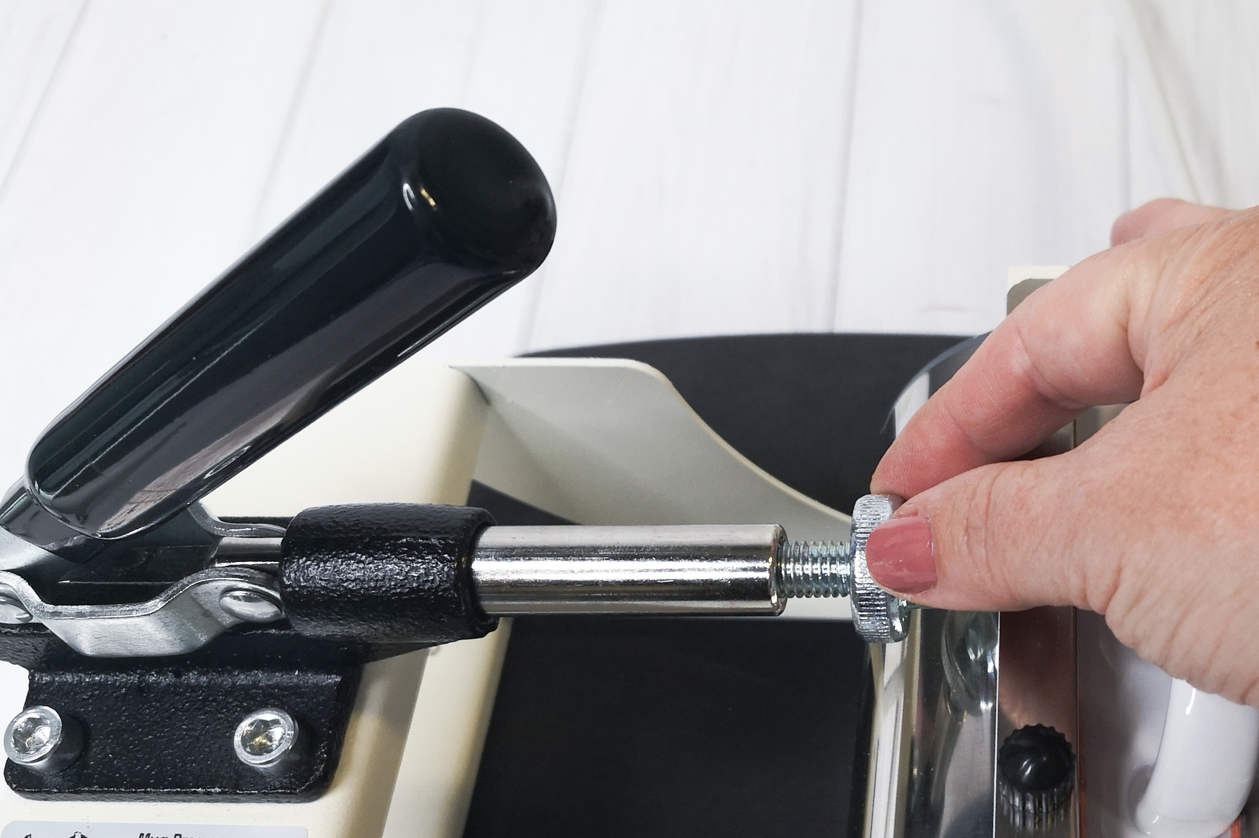 Bevor ich die Temperatur einstelle, überprüfe ich im kalten Zustand den Sitz der Tasse in der Tassenpresse. Die Tassenpresse sollte sich so schließen lassen, dass die Tasse fest in der Manschette sitzt und nicht mehr verrutschen kann.