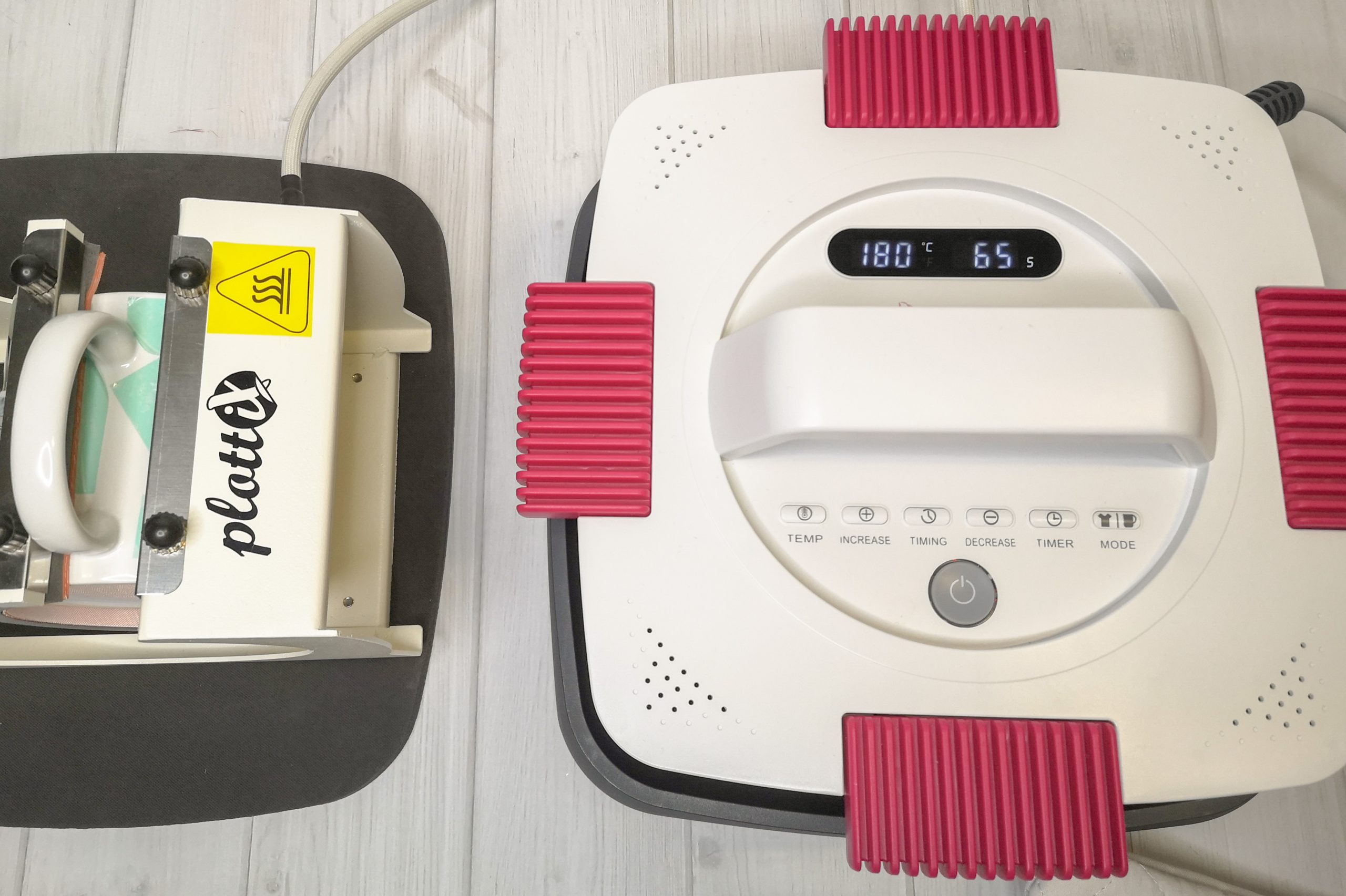 Die fertig eingestellte plottiX Tassenpresse heizt nun vor.