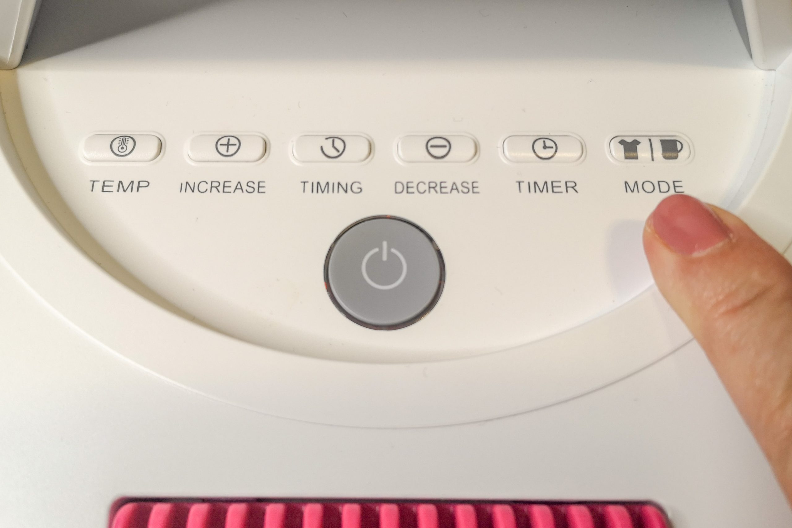 Zuerst wechsle ich mit dem Drücken der MODE Taste den Tassenpressen Modus. Sobald das Licht um den Ein-/Ausschalter orange aufleuchtet befindet sich die Presse im Tassentransfer-Modus.