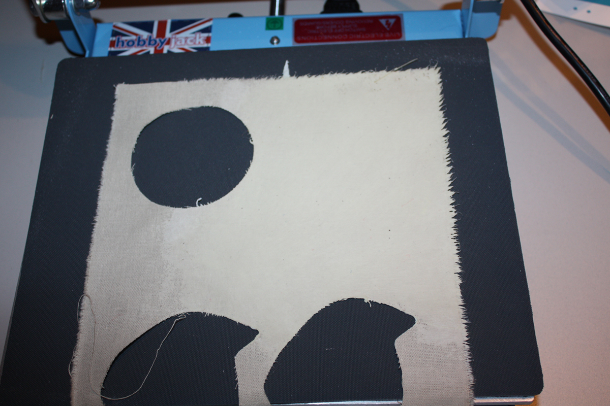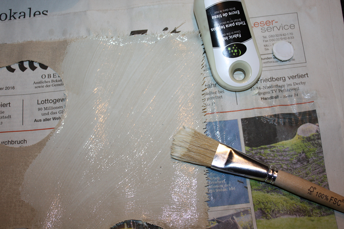 Als nächstes wurde zunächst ein Stück Stoff vorbereitet. Dazu wurde es mit der „Glow in the Dark“ – Farbe von Silhouette behandelt. Um ein gutes Leuchten im Dunkel zu erreichen habe ich die Prozedur drei Mal wiederholt.