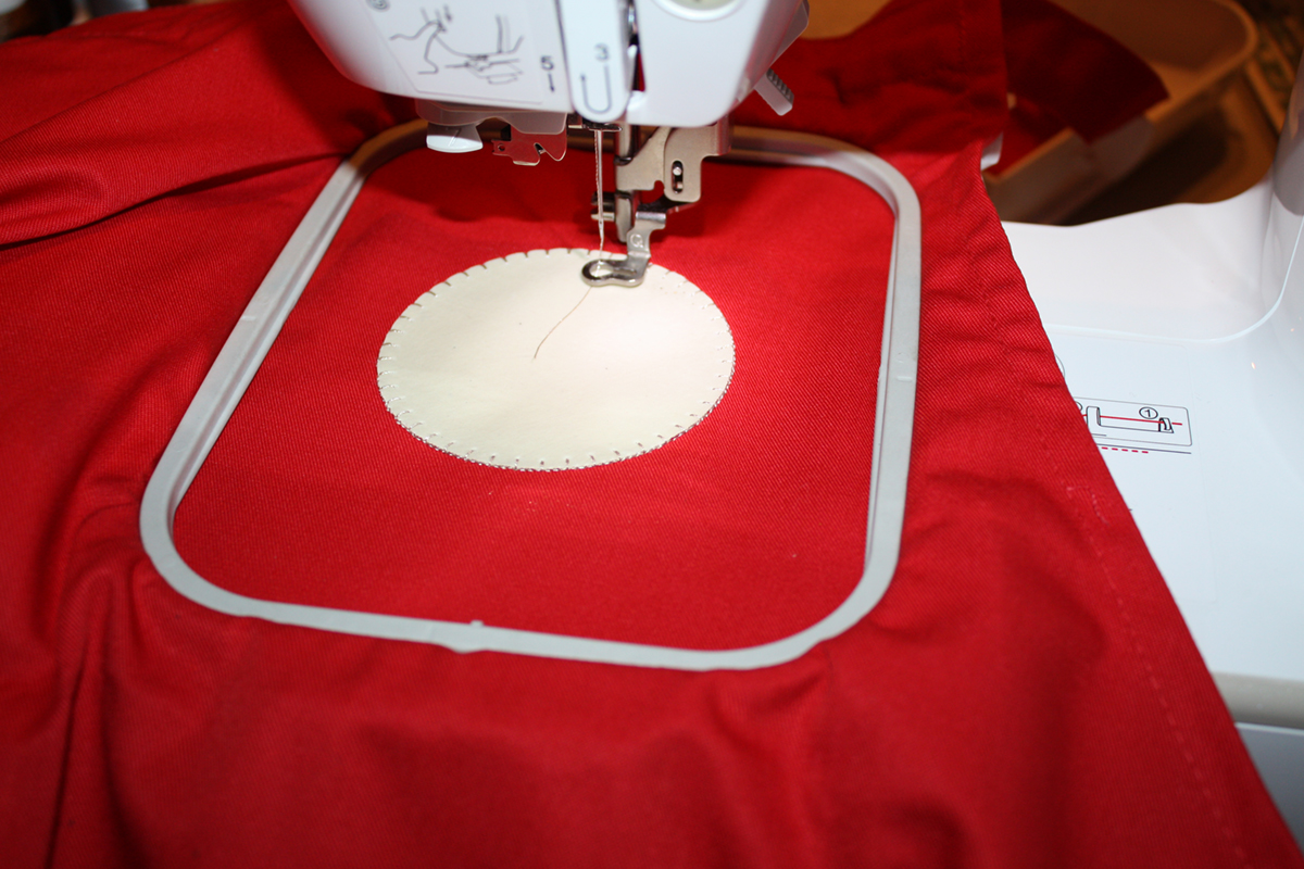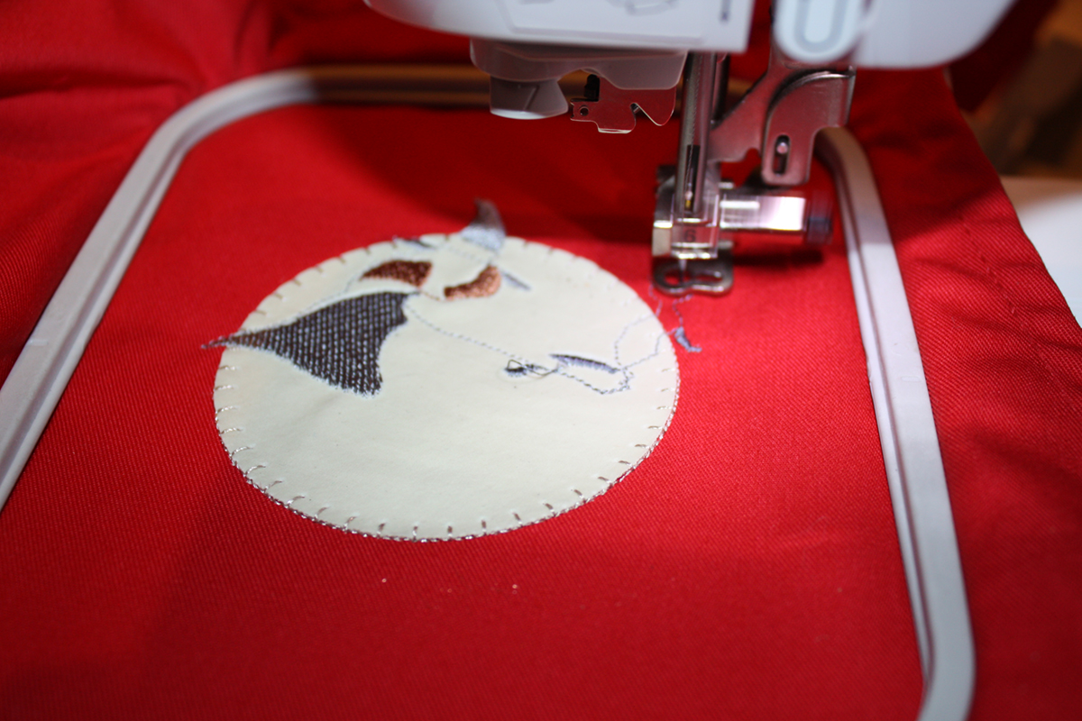Im nächsten Schritt geht es mit der PES-Datei wieder an die Stickmaschine. Dort wird als erstes die Position des Stoffteiles mit einer Naht angezeigt und das Stoffteil dann auch vernäht.