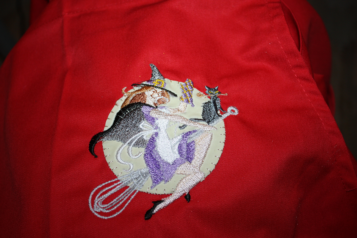 Nach kurzer Zeit ist unsere freundliche Hexenapplikation auf der Schürze fertig. Neben die nette Hexenapplikation wurde nun noch ein netter Spruch mit dem Namen der Beschenkten gesetzt, den wir hier aber nicht zeigen möchten.