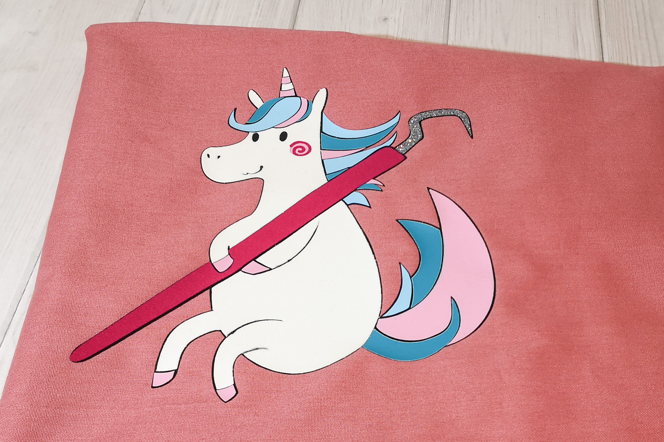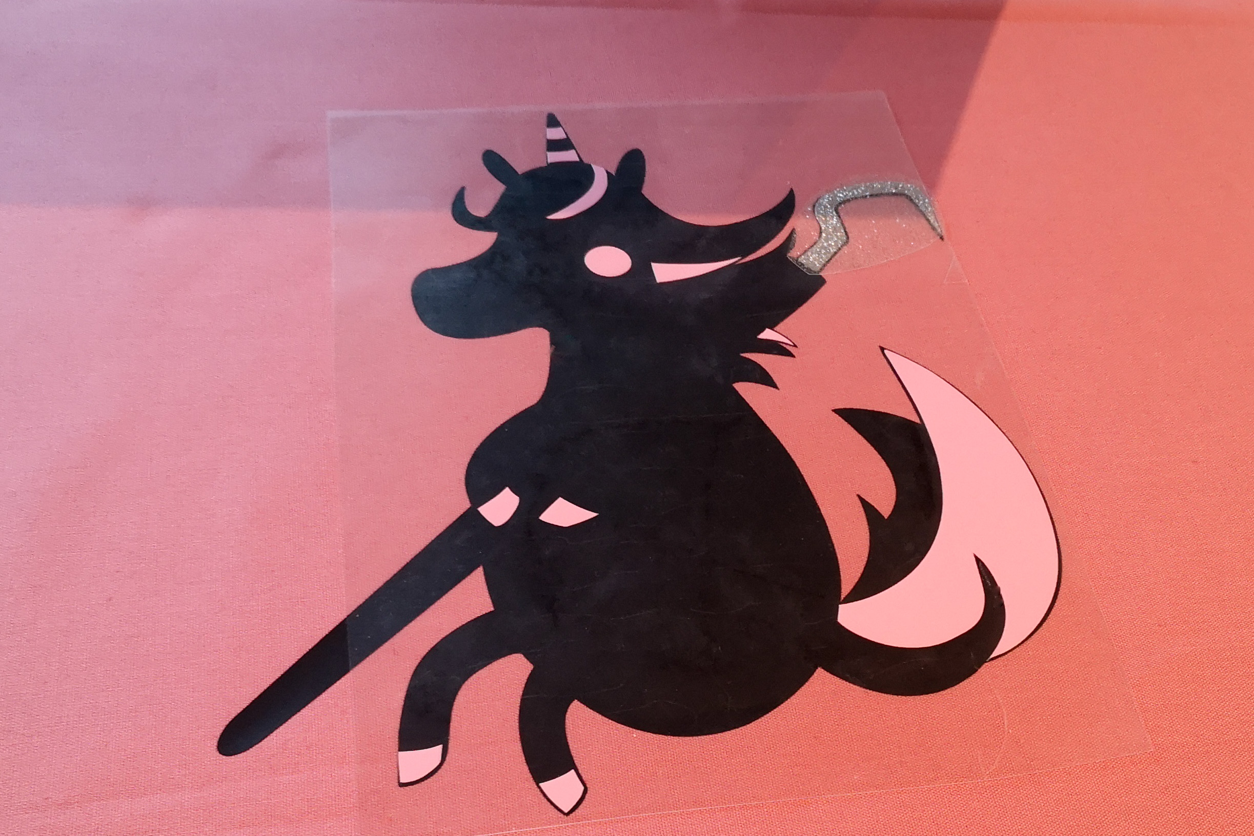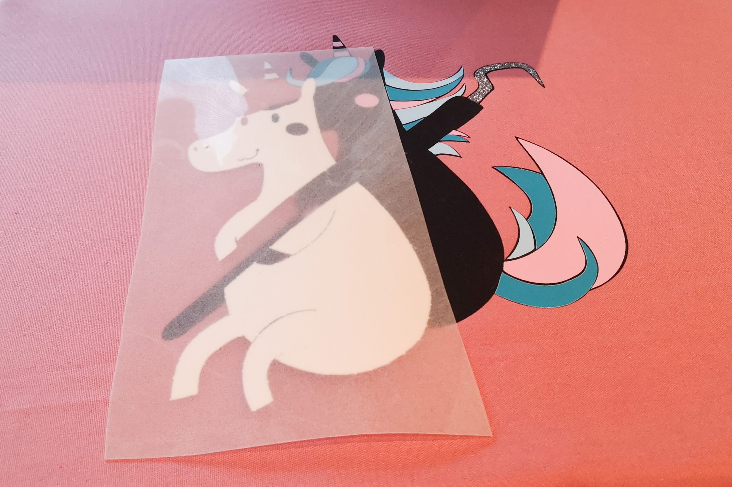 Nach und nach presse ich nun meine anderen Folien des Einhorn Freebies auf den Hintergrund. Bitte beachte: bei der Verwendung der Puffy Flex Folie, presse ich diese bewusst zuletzt auf, da sie einen 3D Effekt unter der angegebenen Temperatur entwickelt. Das Aufpressen der anderen Folien würde danach schwierig werden.