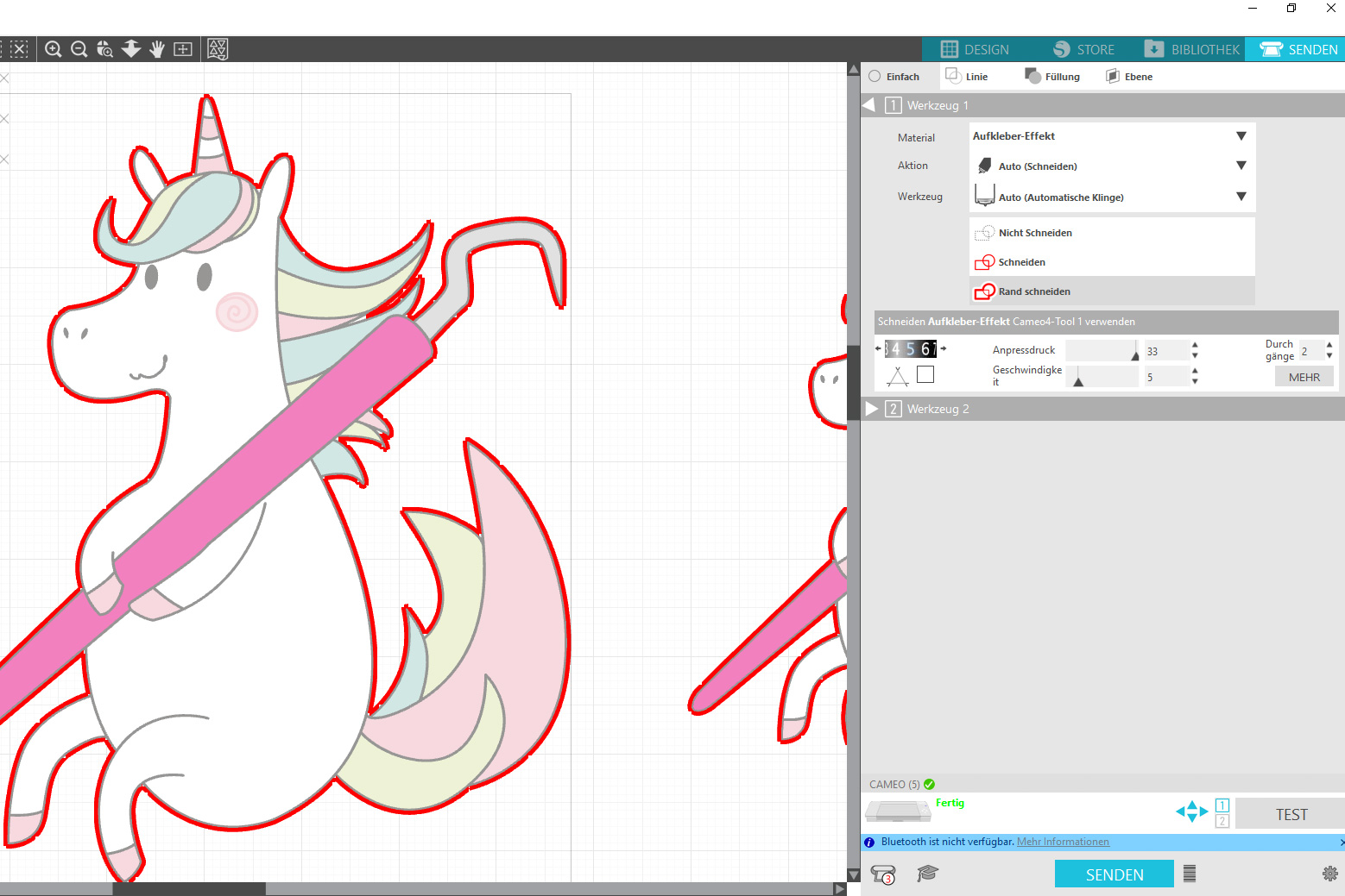 Wenn ich mein Einhorn Freebie mit einem kleinen Rahmen ausschneiden möchte, setze ich nun vor dem Senden des Schneideauftrags noch ein Offset um die Einhörner.