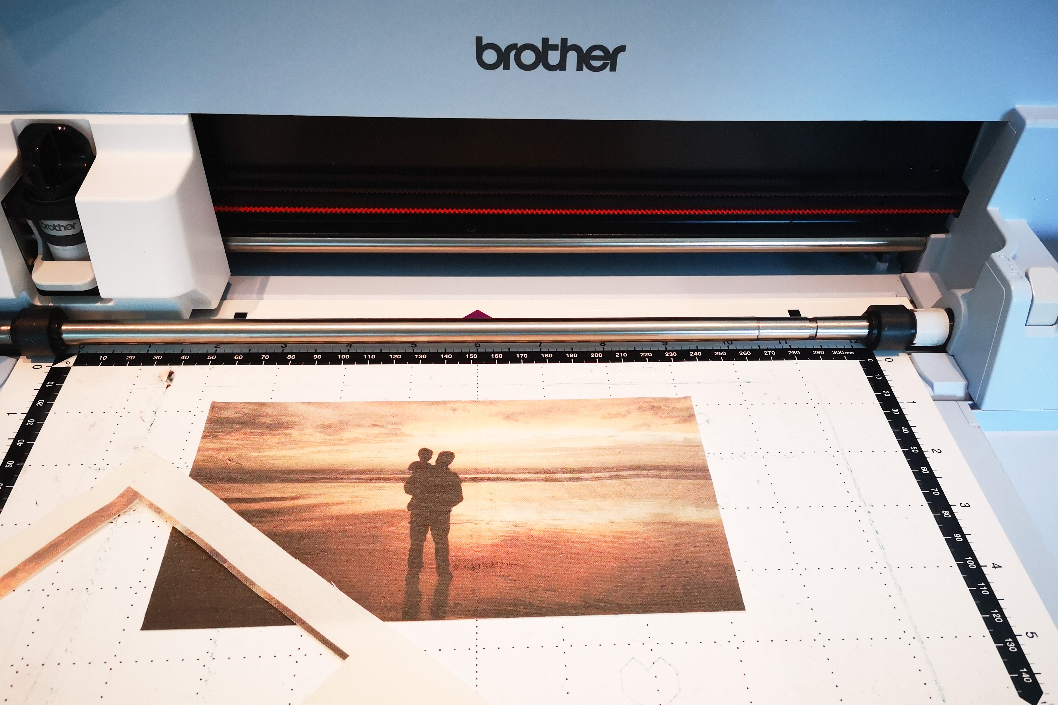 Nun übertrage ich den im Brother CanvasWorkspace erstellten Text an meinen Plotter. Zur genauen Positionierung scanne ich meine Schneidematte mit der Stoffkarte darauf. Im Anschluss fixiere ich die Foil Quill Folie auf meinem Stoff mit etwas Masking Tape. Mit dem vorgeheizten Heizstift in der Messerhaltung wird nun mein Muster – der Schriftzug „Danke Papa“ nachgezeichnet. (Schriftart: Clarissa von dafont).