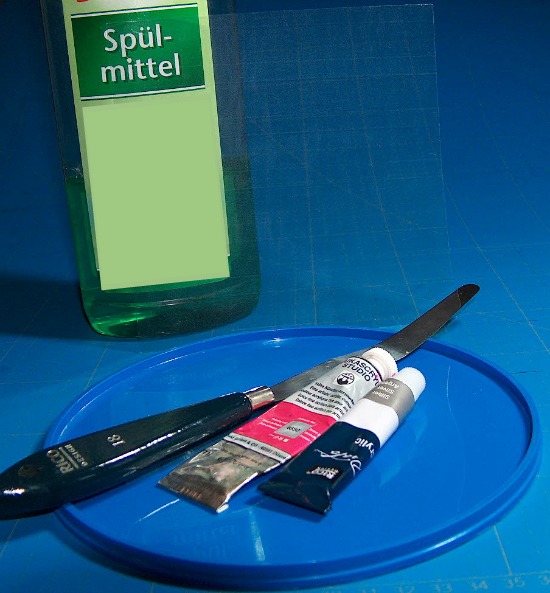 -Bastelkleber, Acrylfarbe, Spülmittel, Mischpalette und Malspachtel