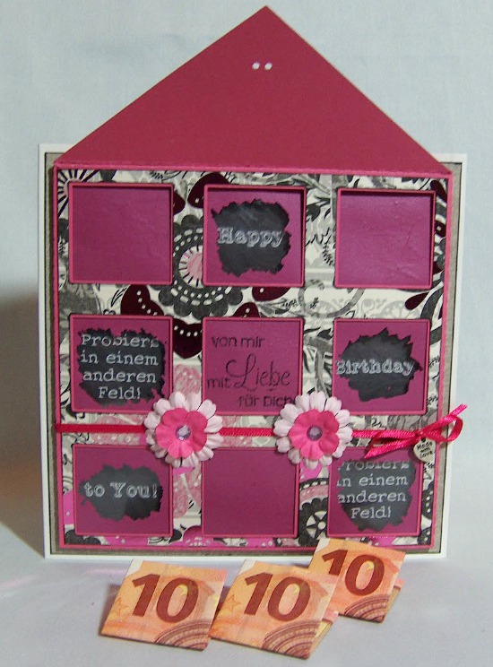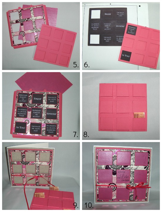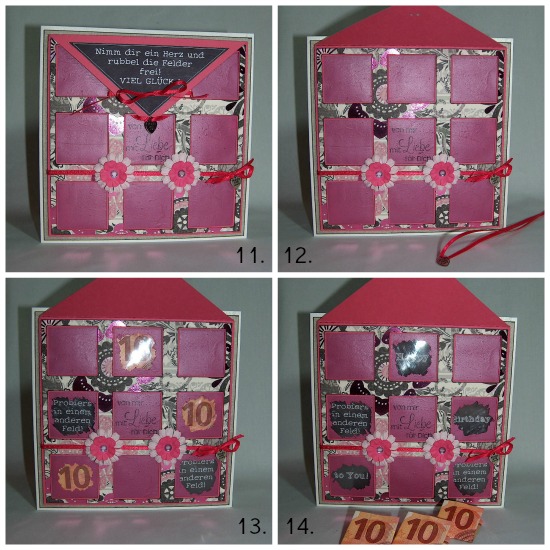 Das Gitter mit den Klebelaschen wird mit dem Gitter aus Motivpapier beklebt und auf die quadratische Karte aufgeklebt, so entsteht die Box (Bild 7. & 9.), in die die vorbereitete Rubbelkarte mit den Taschen eingelegt wird, ohne diese innen festzukleben, sonst kann man die gefalteten Geldscheine nachher nicht entnehmen (Bild 8).