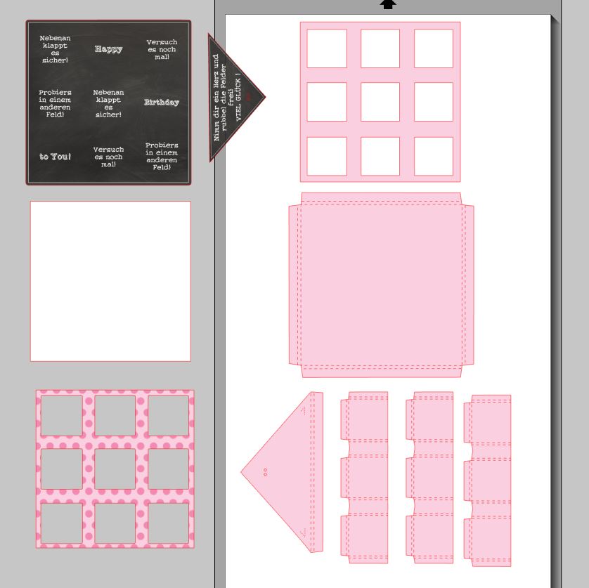 ScreenshotWie immer fange ich an mit der Erstellung der Schneidedatei. Dabei kommt es oft vor, dass ich während der Datei-Erstellung noch Änderungen an meinem eigentlichen Konzept vornehme. Hier kam kurz vor Fertigstellung der Karte noch die dreieckige Klappe mit dem Text dazu. Schließlich muss man dem Geburtstagskind ja mitteilen, was es mit den Feldern auf sich hat.
