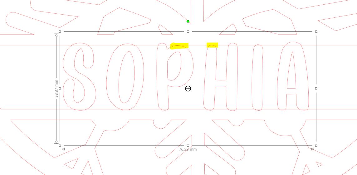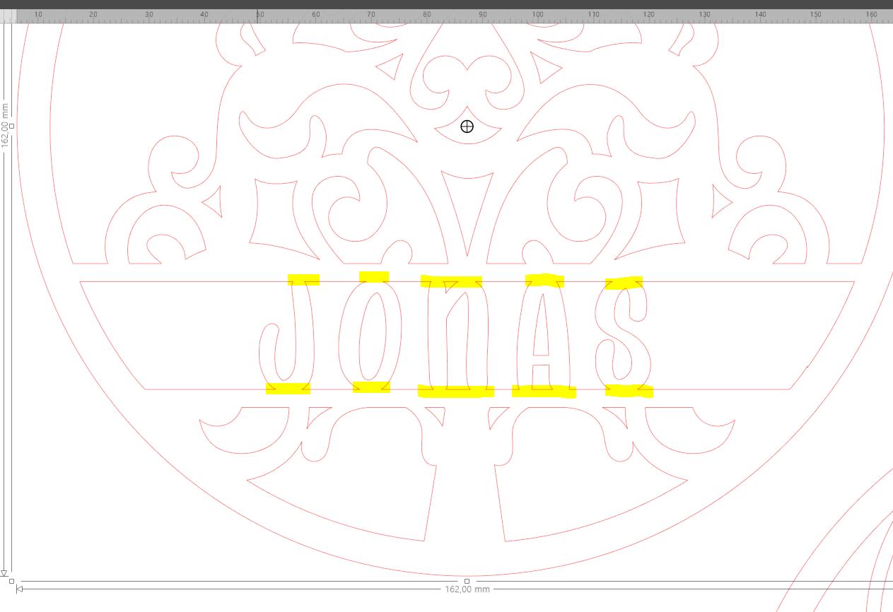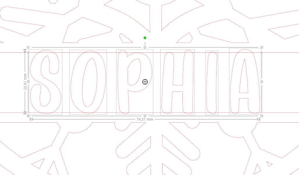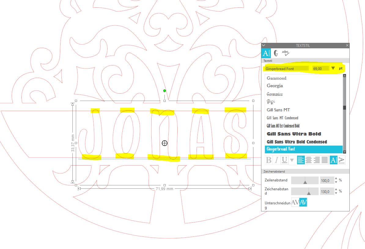 Wählt eure Schriftart „Gingerbread Font“ aus und schreibt den gewünschten Namen am besten in Großbuchstaben. In meinem Beispiel war sie 69pt groß. Nun müsste jeder Buchstabe über das „Kästchen“ ragen und kann somit verschweißt werden.