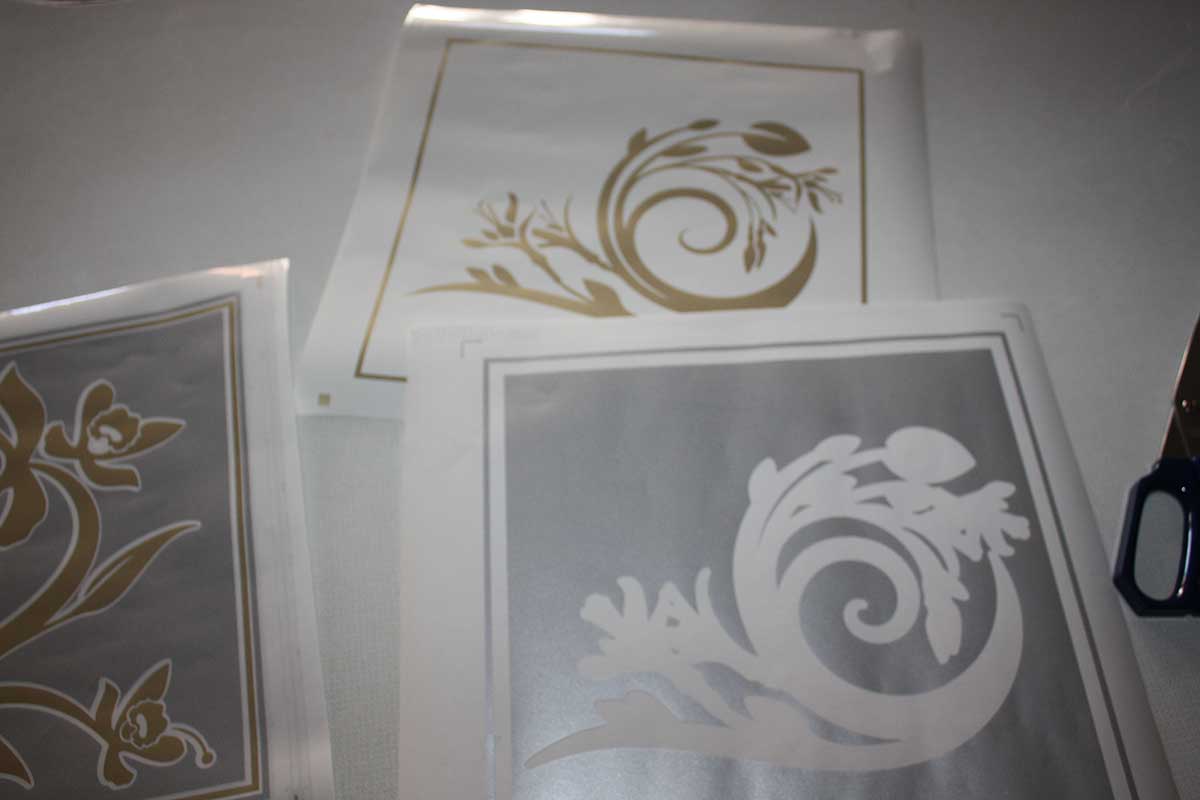 Nachdem für alle einzelnen Designs jeweils der Teil in „Silber“ und „Gold“ mit Passermarken geplottet und entgittert war (rechts im Bild) mussten die zusammengehörigen Teile mit Hilfe der Passermarken sauber montiert werden. Und mit Transferfolie versehen werden. Das Ergebnis davon erkennen Sie links im Bild.