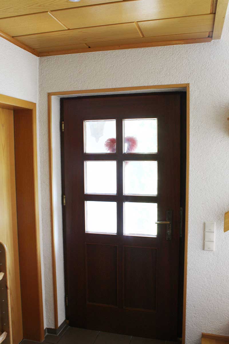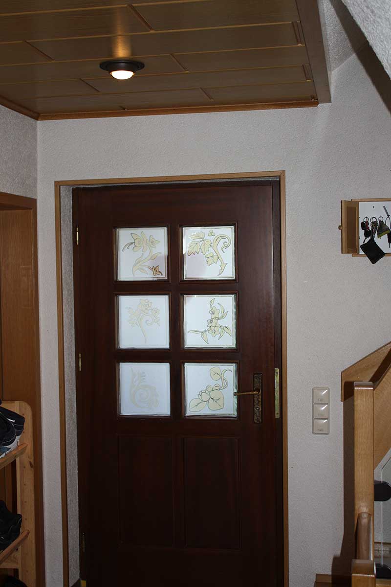 Haustüre deren Sprosenfenster mit Glasdekorfolie verschönert werden sollen