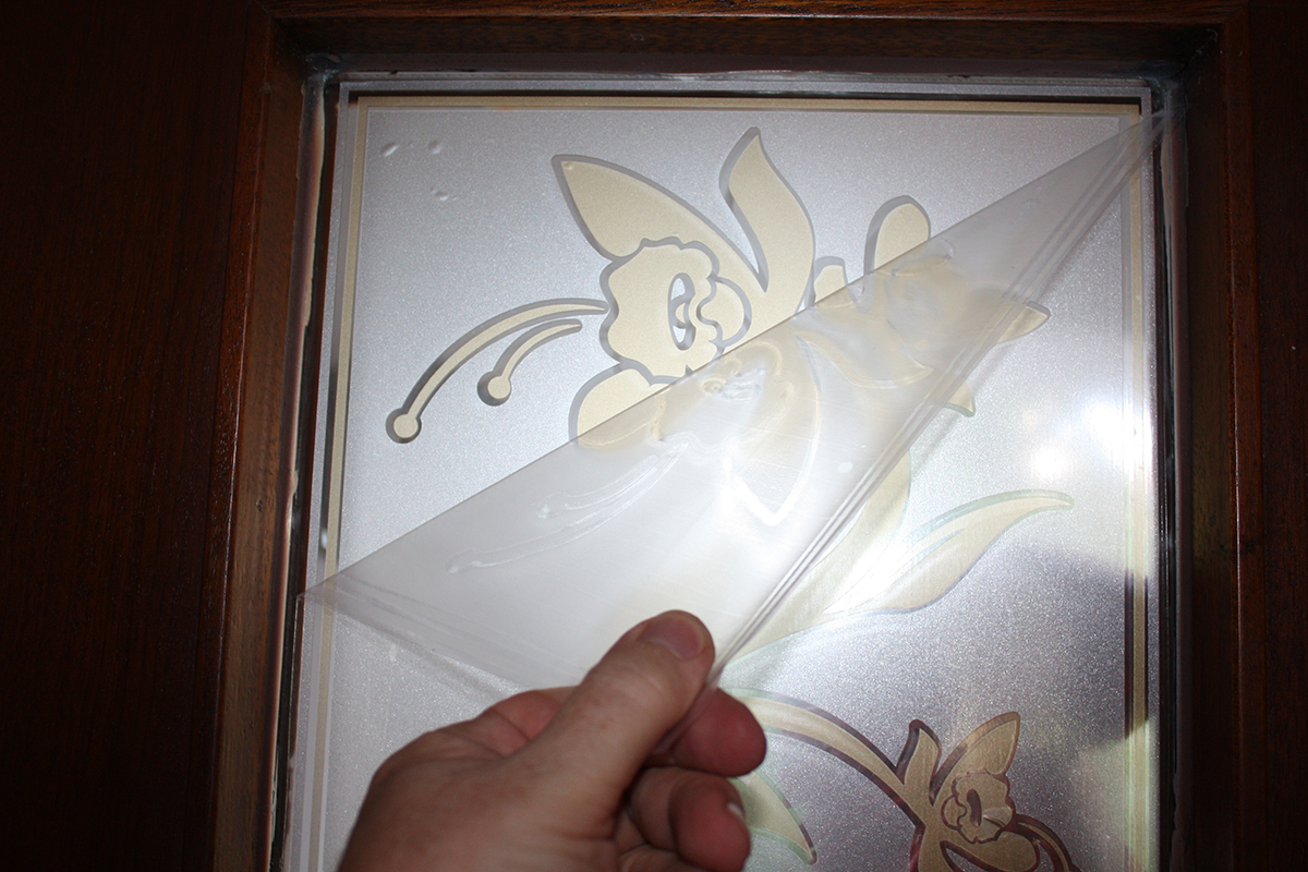 Nach dem Vorbereiten aller sechs Dekore wurde mit der Montage begonnen. Dazu ist zunächst die Scheibe absolut sauber zu putzen, damit keine Staubteilchen oder anderer Schmutz auf dem Glas sitzen. Hiernach wird die Glasdekorfolie vorsichtig mit dem Rakel blasenfrei auf das Glas aufgebracht. Dabei zieht man das Trägerpapier langsam nach unten weg.