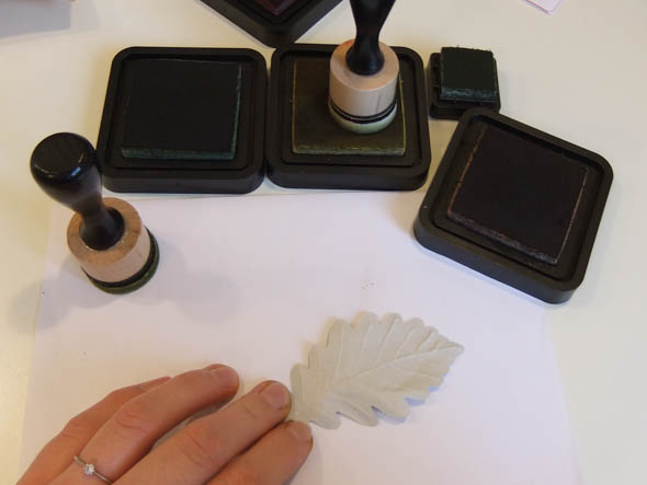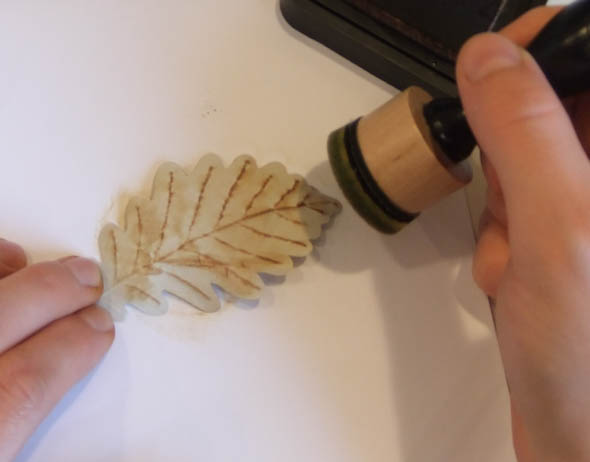 Zunächst habe ich mit einem dunkleren Farbton vorsichtig über die Blätter gewischt (erhabene Seite des Blatts liegt oben). Hierdurch kommt die geprägte Struktur sehr schön zur Geltung: