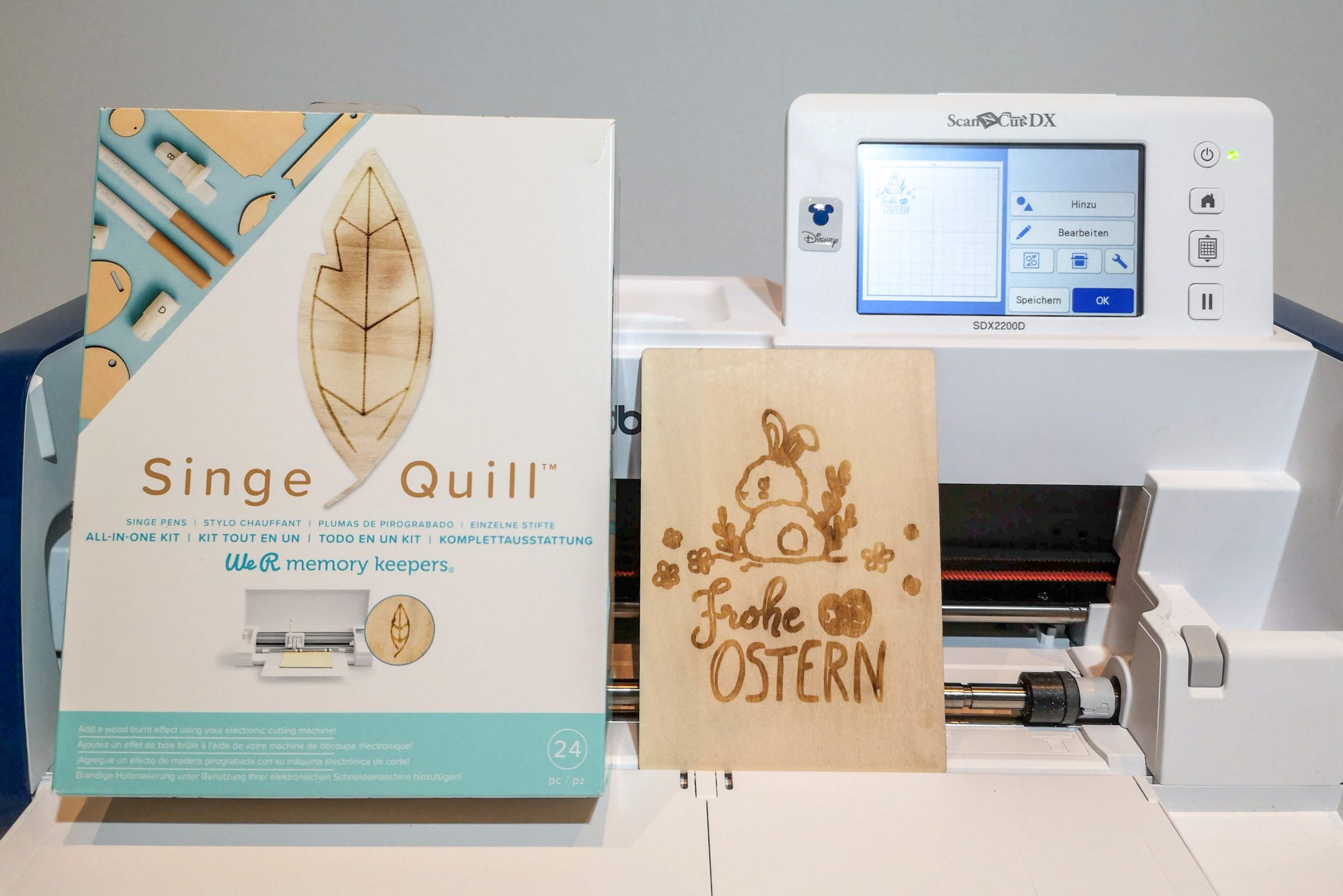 März – Die perfekte Zeit um mit der Osterdekoration und den Grüßen zu Ostern zu starten. Unser März-Freebie „Frohe Ostern“ von der Designerin Anne Lindemann haben wir dieses Mal nicht nur geplottet, sondern auch mit dem Singe Quill Starter Set mit dem tollen Brandzeichen-Effekt für euch gezeichnet.