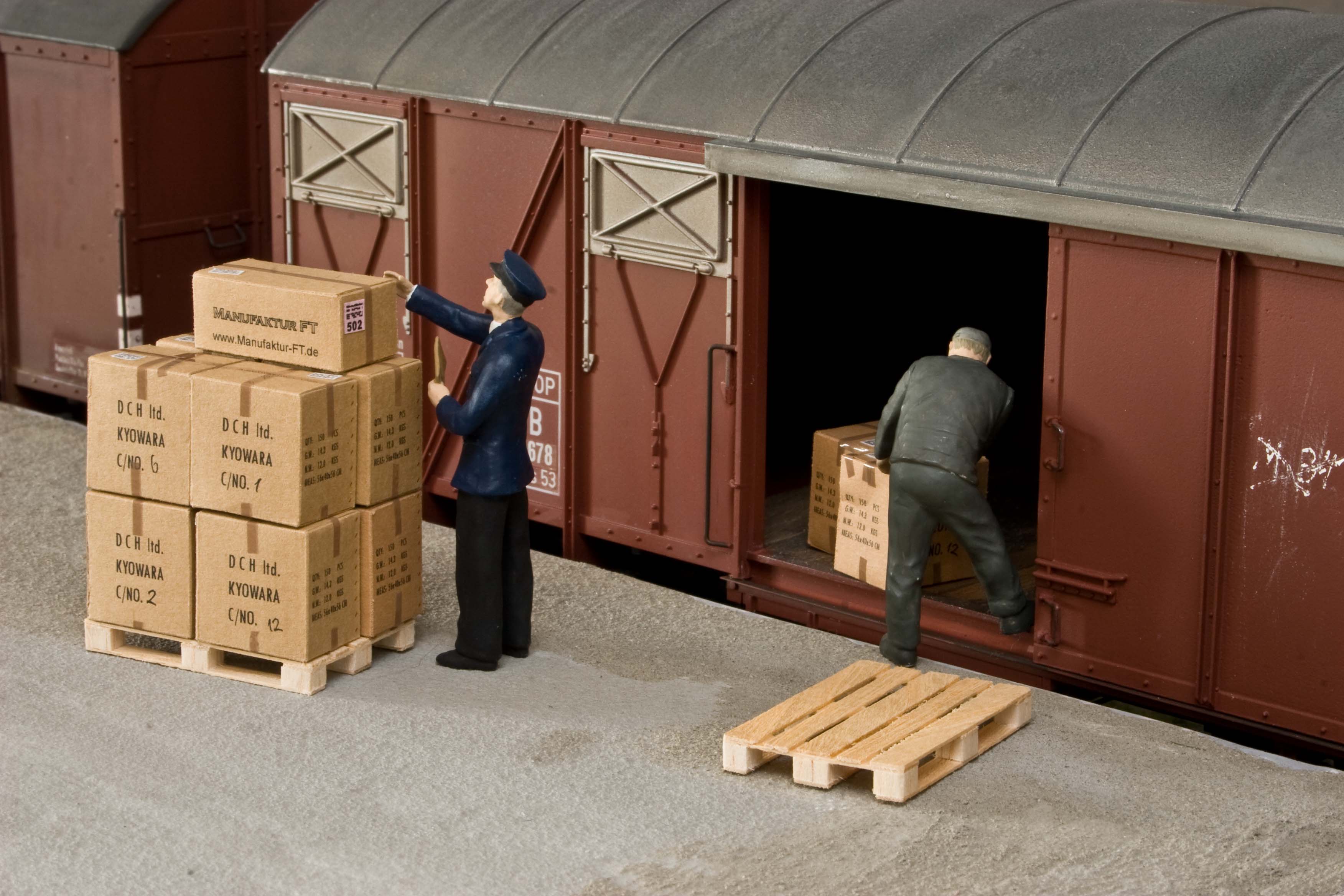 Kartons werden in einen Modelleisenbahnwagen verladen.