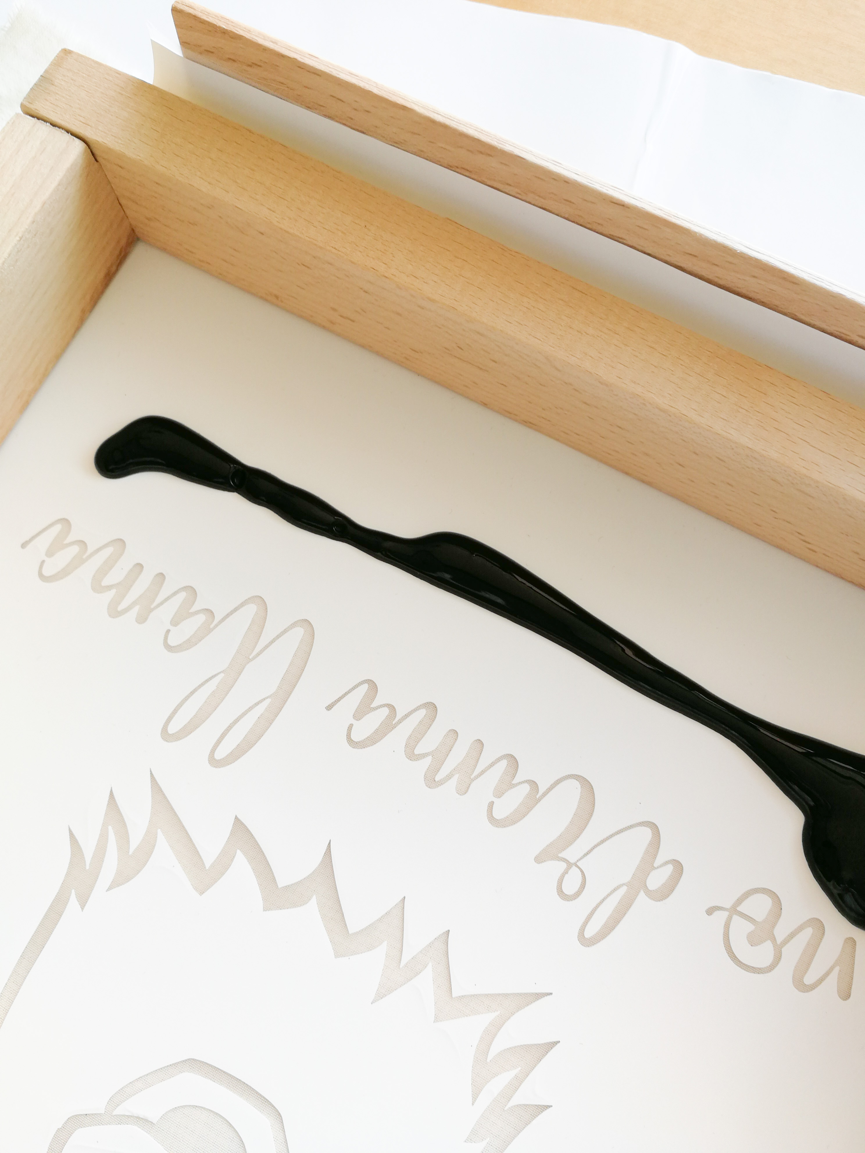 Bevor ich mit dem Bedrucken meines Shirts starte, teste ich zusätzlich erst einmal auf einem Stück Stoff. Anschließend lege ich ein festes Stück Pappe zwischen die beiden Lagen meines Stoffes, damit verhindere ich ein durchdrücken der Farbe. Danach lege ich den Rahmen passgenau über das Shirt. Der Stoff sollte möglichst glatt und faltenfrei sein. Ich verteile jetzt eine Linie der beiliegenden Stofffarbe („fabric ink“) oberhalb meines Motivs auf den farbundurchlässigen Bereich.