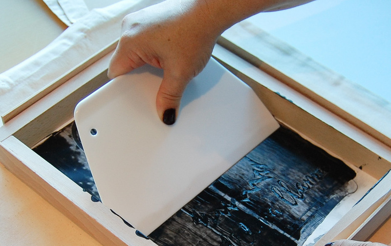 Hierbei achte ich darauf, genug Farbe aufzutragen, damit ich diese in einem Zug über das komplette Motiv verteilen kann. Dafür ist allerdings etwas Übung notwendig. Im Anschluss streiche ich die Farbe nach unten und verteile sie so durch die offenen Maschen des feinen Gewebes auf meinem Shirt.