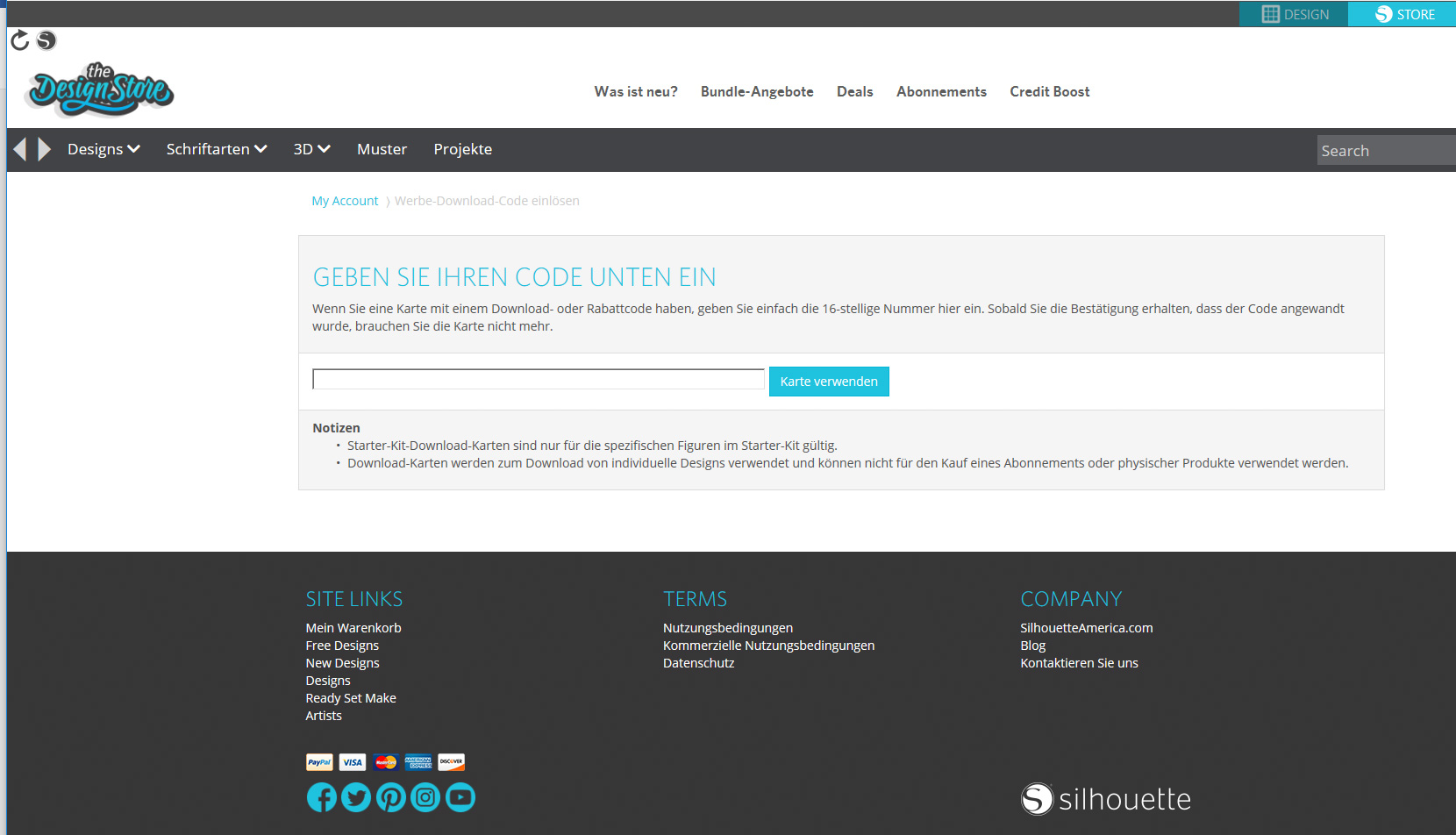 Wer die exklusiven Silhouette Siebdruck Starter Kit enthaltenen Designs nutzen möchte, kann sich diese vorab im Silhouette Store herunterladen. Unter „Mein Konto“ gibt es die Spalte „Werbe-Download-Code einlösen“.