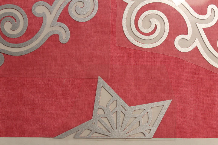 Um die entgitterten Sterne und Schnörkel aufbügeln zu können, legte ich den Stoffzuschnitt wieder auf die „Clean-Cut“-Trägerfolie und bügle sie nach Packungsanweisung auf.