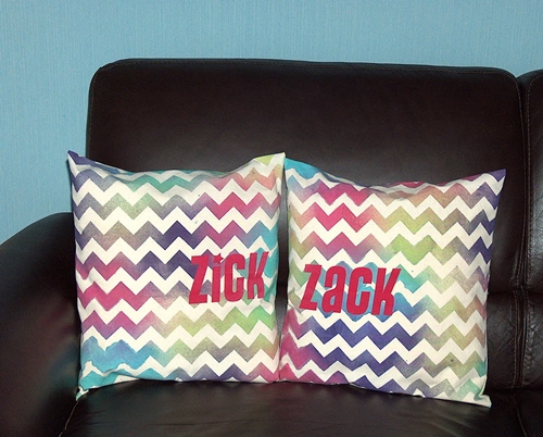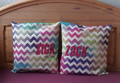 Nach dem Abziehen der Klebestreifen sieht das ganze so aus. Meine gefärbte Fläche hat ca. 80 cm Breite und 50 cm Höhe. Das Stoffstück war grob zugeschnitten, um zwei Kissenbezüge daraus zu Nähen. Nach dem Fixieren der Textilfarbe (Anleitung beachten) habe ich den Stoff noch der Länge nach halbiert und zwei Kissenbezüge mit Hotelverschluss daraus genäht. Hotelverschluss bedeutet ohne Knopflöcher, klingt aber sehr vornehm, oder? Der Kissenbezug ist kinderleicht und Ruck-Zuck-ZICK-ZACK genäht.