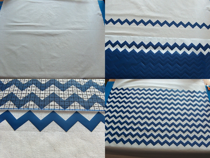 Den Baumwoll-Stoff habe ich vorgewaschen und gebügelt. In der Mitte habe ich eine Falte gezogen, als erste Hilfslinie. Dort habe ich den ersten Zick-Zack-Streifen aufgeklebt. Mit dem Fingernagel habe ich entlang des Lineals die nächste Anlegelinie gezogen und so die restlichen Streifen aufgeklebt, von der Mitte aus in beide Richtungen verteilt.