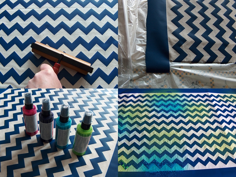 Nach dem Sprühen habe ich mit Küchenrolle die überschüssige Farbe abgetupft, die auf der Klebfolie stehen bleibt. So gibt es beim Entfernen der Klebestreifen weniger Flecken auf dem Stoff und die Umgebung wird nicht vollgespritzt.