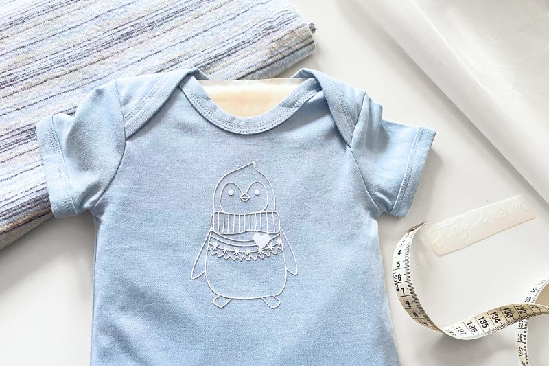 - Übertrage das Design mit der Transferpresse. Gerade bei so kleinen Textilien lohnt sich ein Ausgleichskissen, um den Höhenunterschied zu den Nähten auszugleichen. Die Antihaftfolie schützt dabei auch noch deine Presse und den Body.