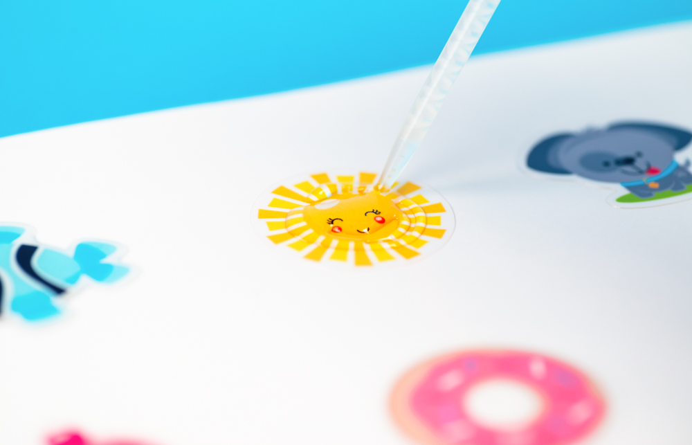 8. Tragen Sie nun langsam Ihr Epoxidharz auf die Fläche Ihrer Aufkleber auf. Arbeiten Sie dabei vom Rand des Designs bis zur Mitte hin. Gehen Sie sparsam mit dem Resin um, da es sonst über die Ränder des Designs auslaufen kann. Um komplexere Designs besser auszufüllen oder kleine Bläschen zu entfernen, empfehlen wir mit einem Zahnstocher zu arbeiten.