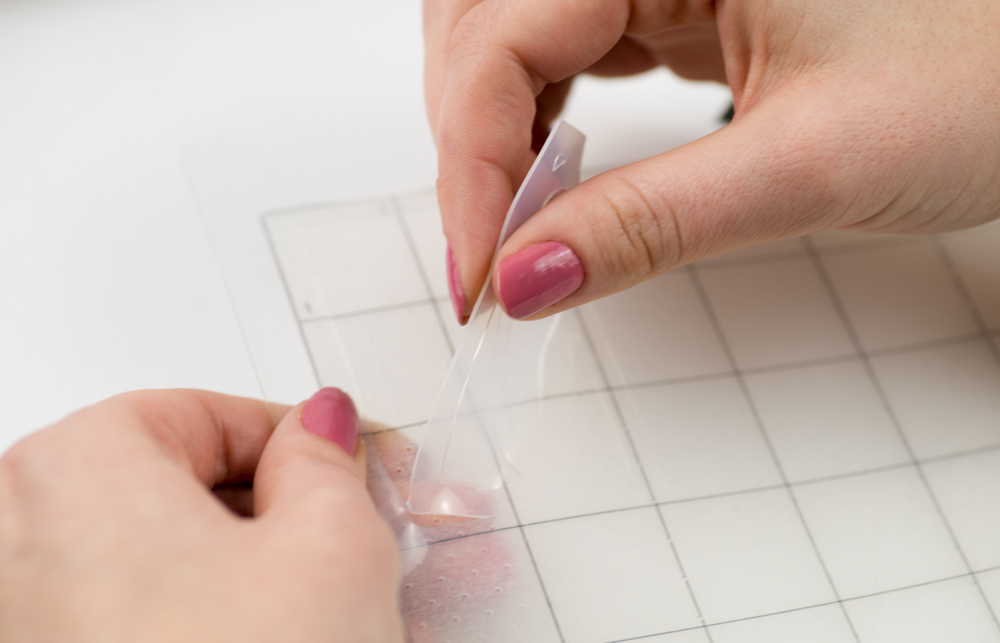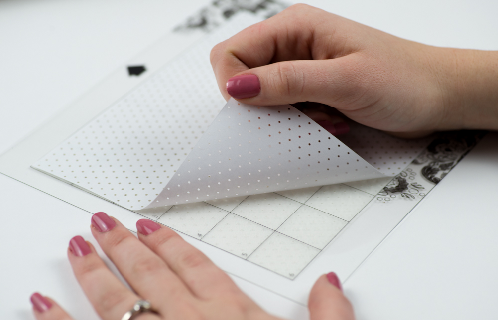 2. Entfernen Sie nun die Schutzfolie von der perforierten Schneidematte.