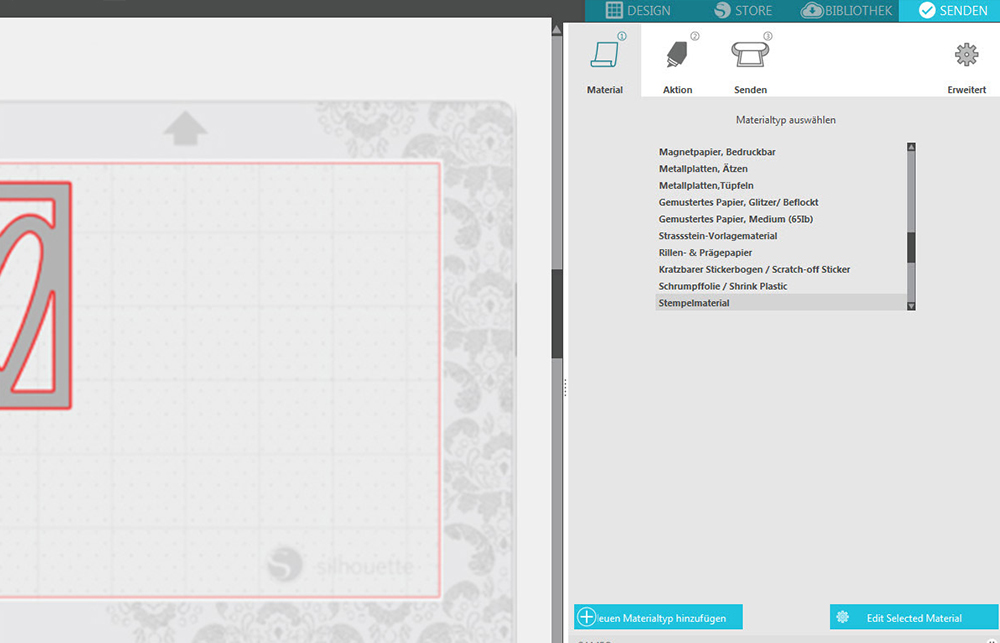 4. Wählen Sie nun das Stempelmaterial im „Senden“ Menü aus und stellen Sie Ihr Messer laut den empfohlenen Angaben ein. Danach kann Ihr Auftrag gestartet werden.