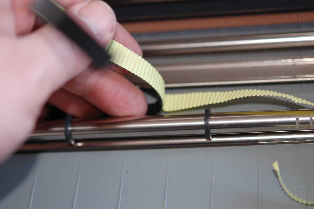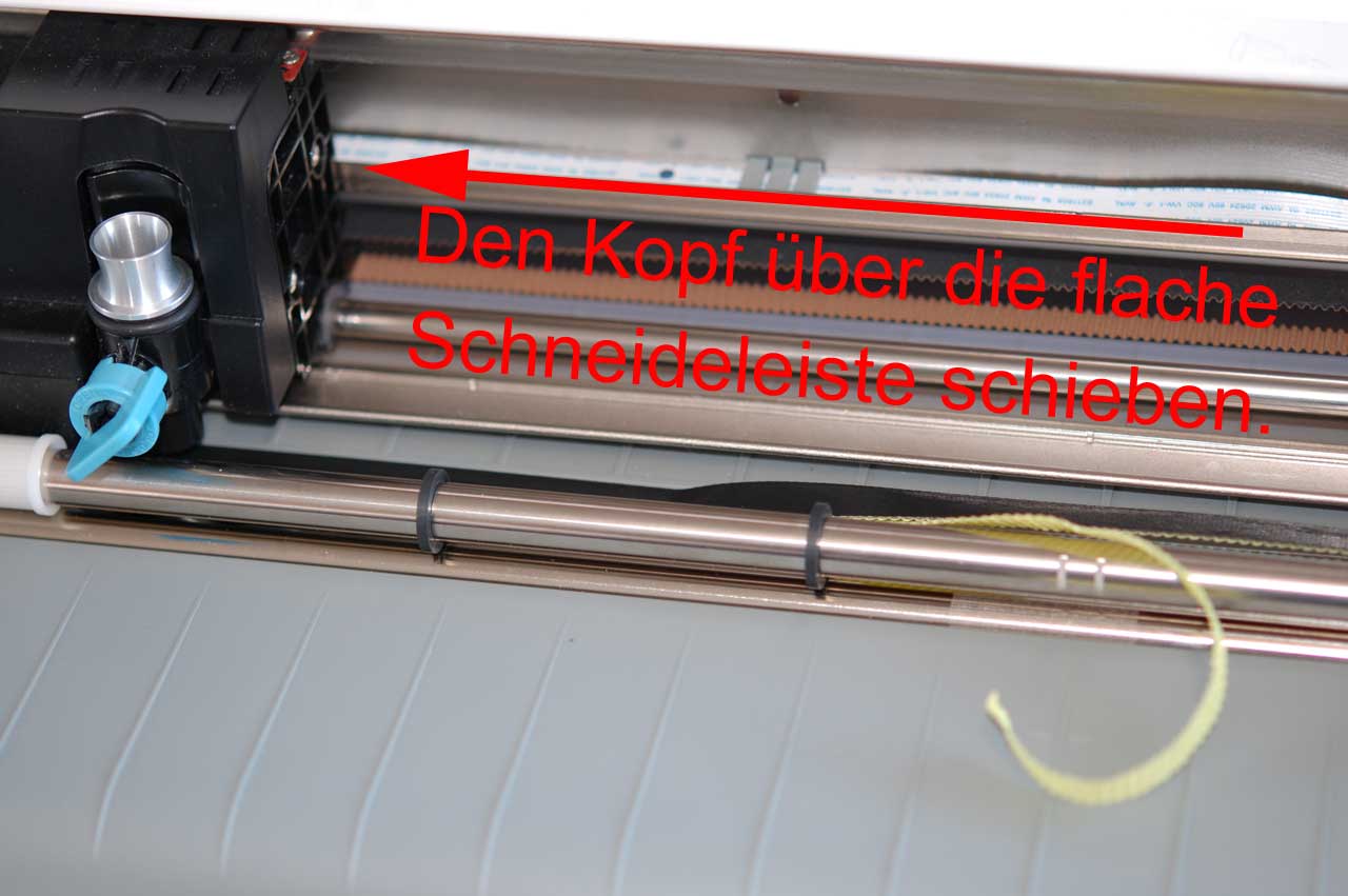 Danach zieht man die Schneideleiste sorgfältig aus dem Gerät. Bitte achten Sie dabei auf den Schneidekopf. Sinnvoll ist es z.B. nach dem die Hälfte der Schneideleiste abgezogen ist, diese erst einmal flach zu legen und den Kopf mit Hand auf die Seite zu schieben auf der die Leiste schon entfernt ist.