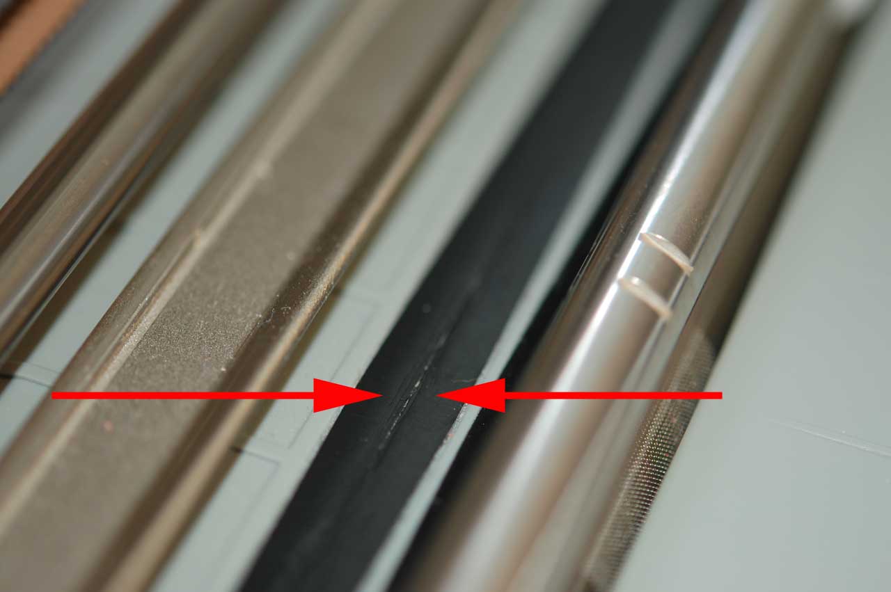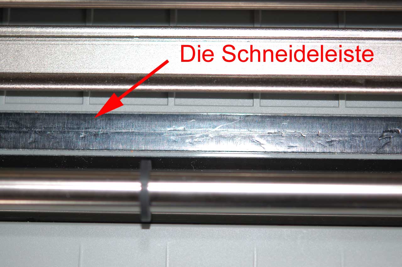 Ein Blick auf die Schneideleiste zeigt das Problem. Die Schneideleiste in diesem Gerät wurde schon sehr stark abgenutzt. Die Schneideleiste zeigt u. A. einen deutlichen „Strich“ in der Mitte. Hier ist die sonst eigentliche glatte Oberfläche deutlich beschädigt.