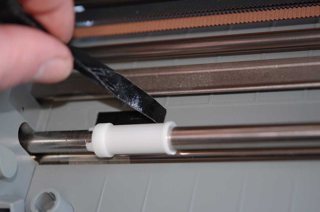 Nun kann die neue Schneideleiste in das Gerät eingeklebt werden. Die Schneideleiste ist als Verbrauchsmaterial für alle Hobbyplotter im Shop erhältlich. Den Schneidekopf des Gerätes stellen Sie dabei am besten zuerst mit Hand auf die rechte Seite und fangen von links an die neue Schneideleiste einzukleben.